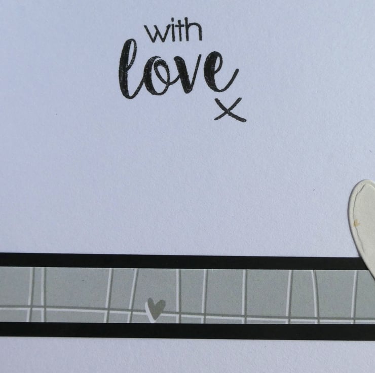 Inside the card the message 'with love x' has been stamped in black archival ink. A band of matching pattered card with a black frame and a pale lemon paper heart have been added across the bottom.