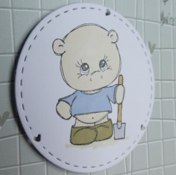 The bear has been hand stamped and inked in shades of blue, green and brown onto white circular card with tiny die cut hearts and stitched edge detail. The image has been slightly raised on foam pads above a printed background with a wonky grid and heart design in soft khaki/green.