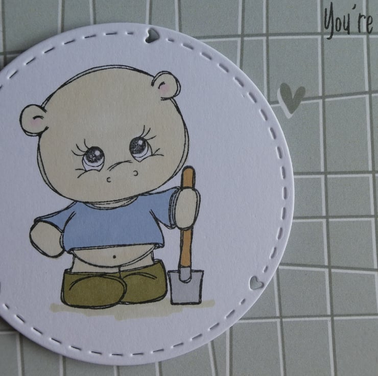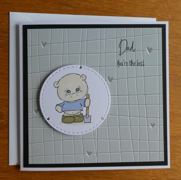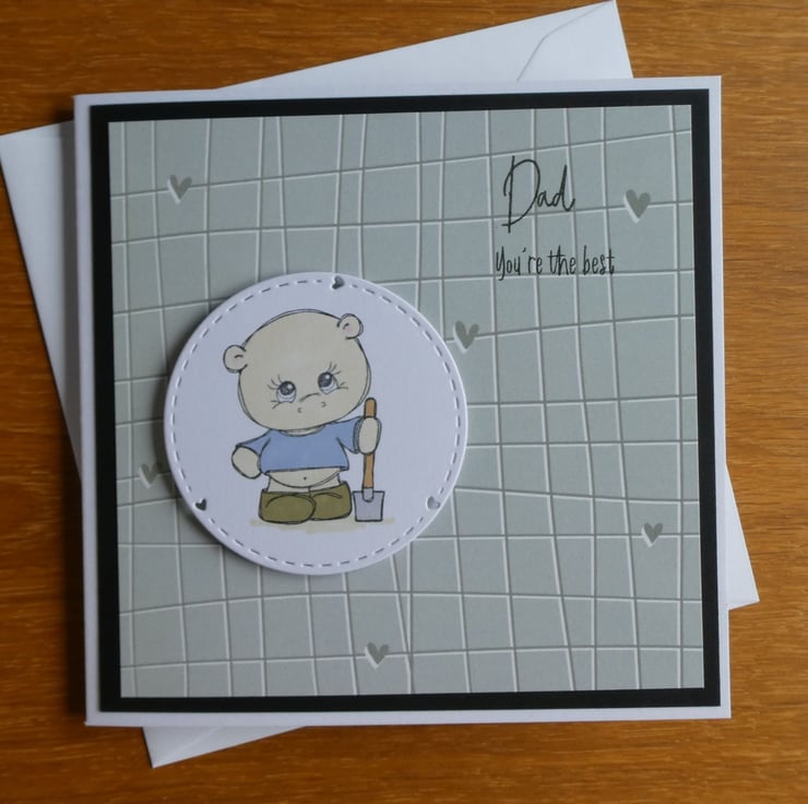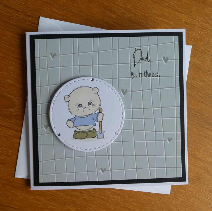With the messages 'Dad you're the best' and 'with love' this card with a cute image of a bear with green wellies and holding a garden spade, against a khaki green background would be ideal to send as a Father's Day card or a birthday card for dad.