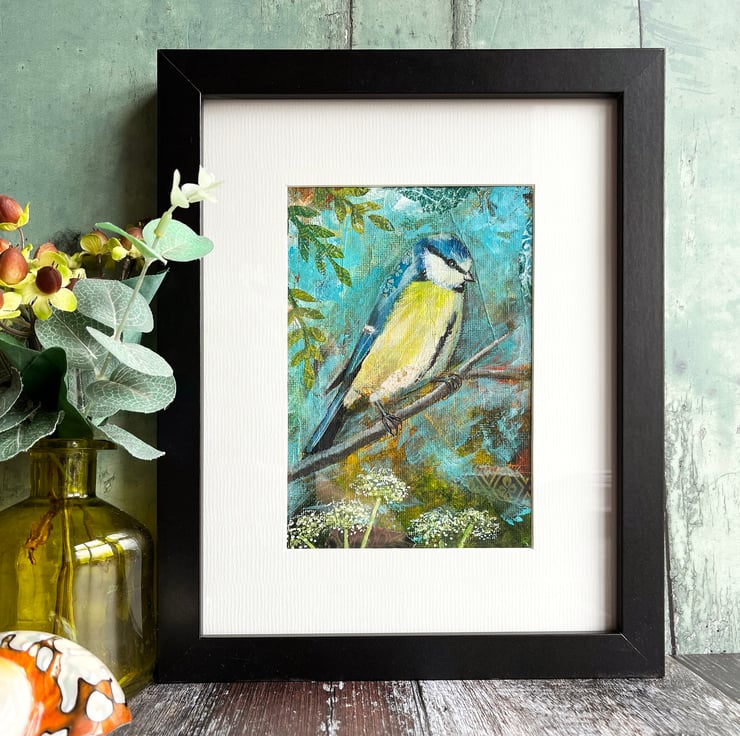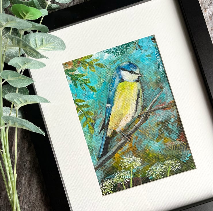 This small, colourful mixed media painting would make a unique gift for a bird lover.