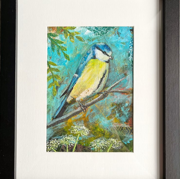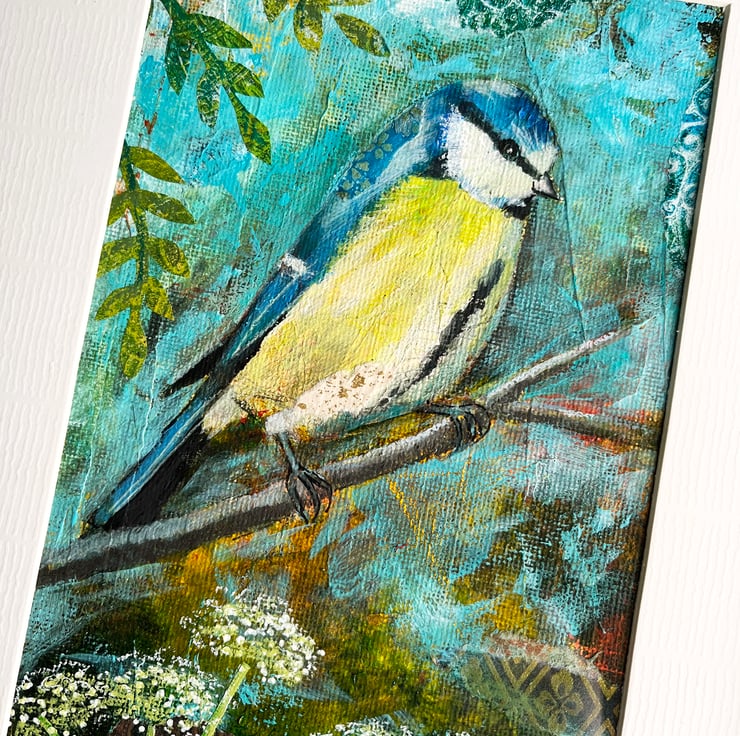 'Blue tit and cow parsley' is the second of three new mixed media pieces in my 'Birds & Blooms' collection. This piece was created on a canvas covered board which had thick layers of gesso applied to create a textured surface. I added layers of acrylic paint and then scraped and rubbed the surface to allow small areas of the background colours to appear. I also used acrylic inks and pastels to add color and shading.