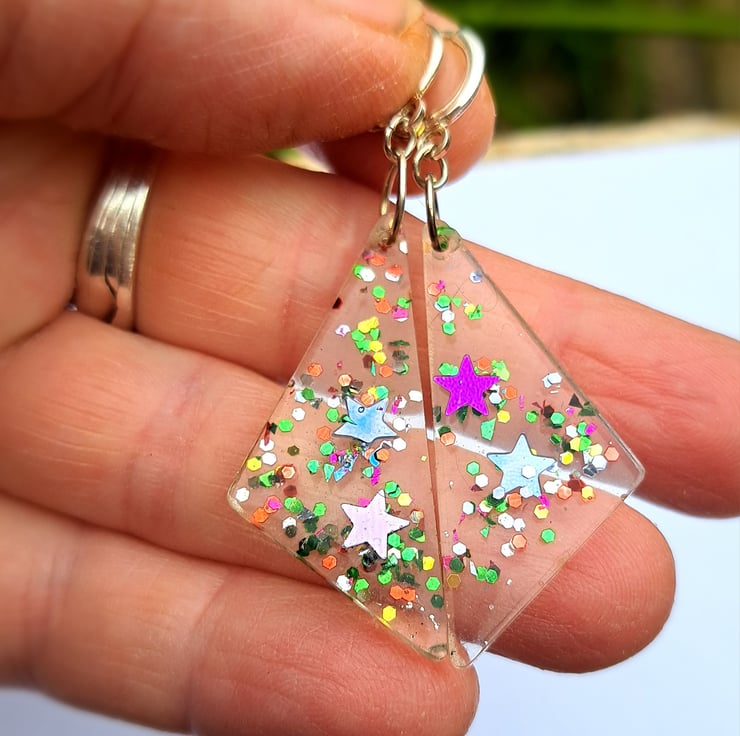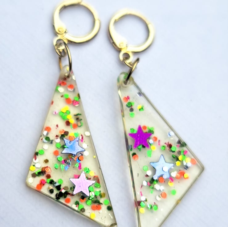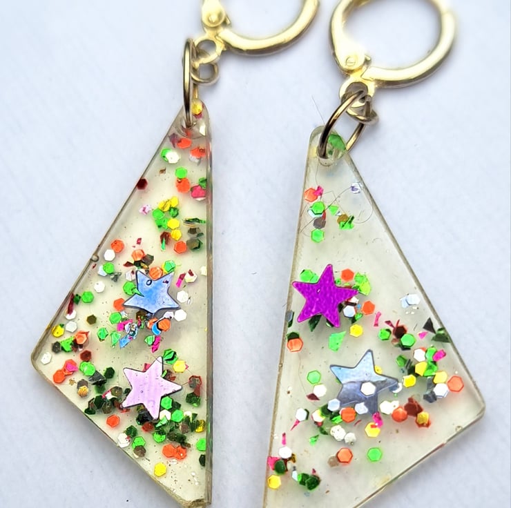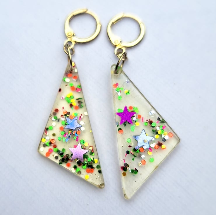 Clear triangular shaped drop down with stars and rainbow glitter, silver plated clasps.
