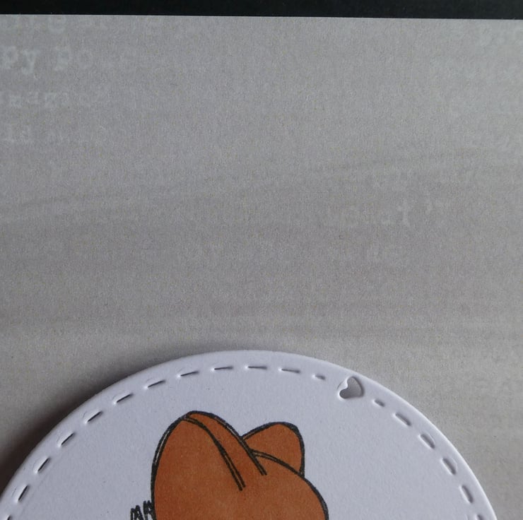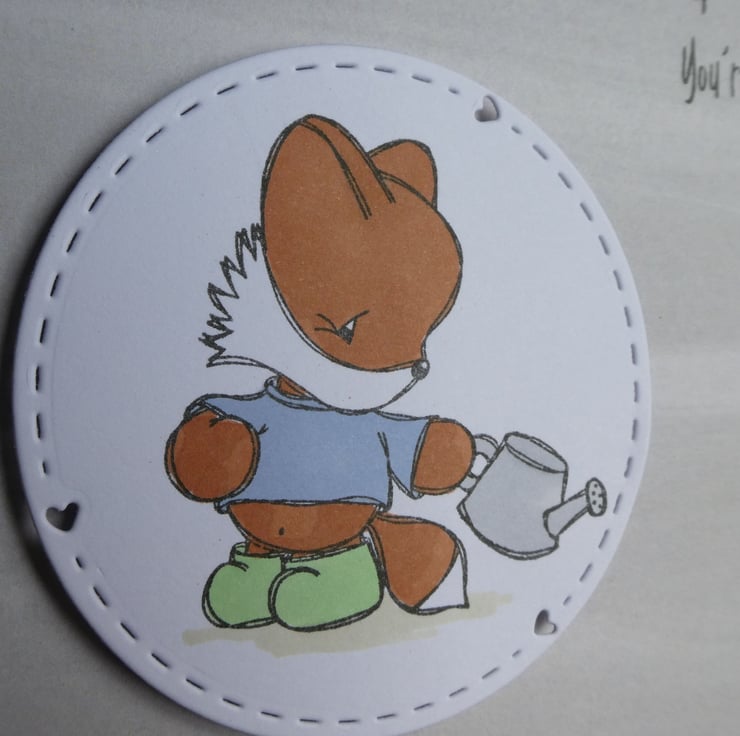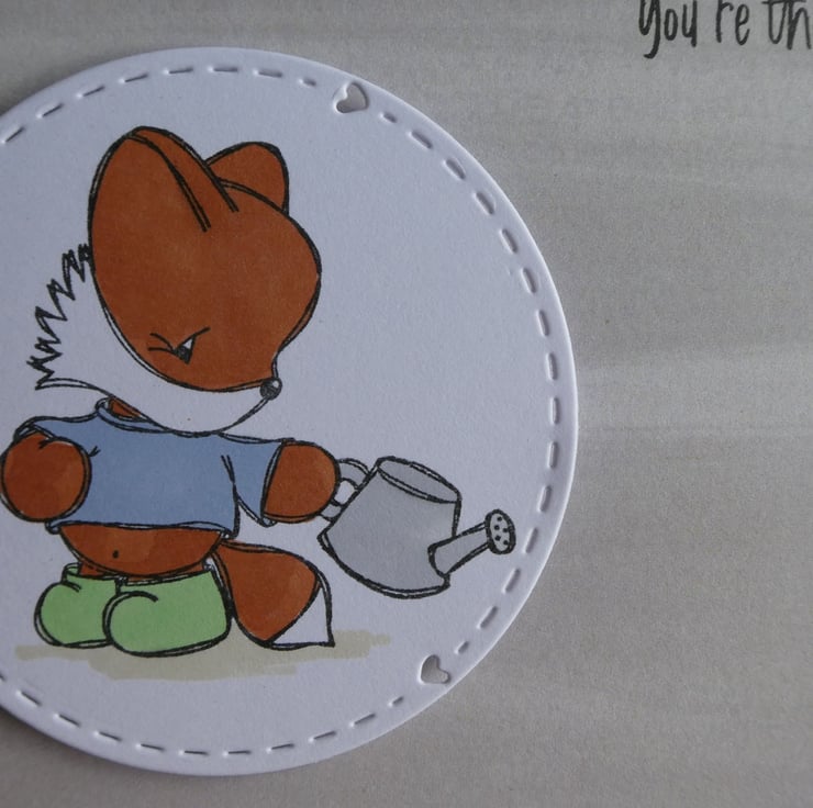The fox has been hand stamped and inked in shades of blue, green and red brown onto white circular card with tiny die cut hearts and stitched edge detail. The image has been slightly raised on foam pads above a printed background with a soft brown design of stripes and text.