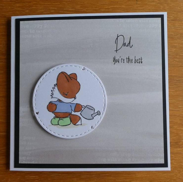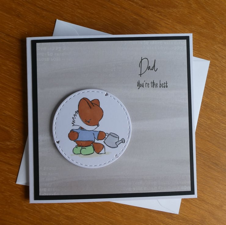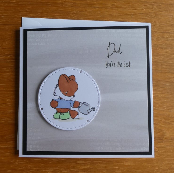 With the messages 'Dad you're the best' and 'with love' this card with a cute image of a fox with green wellies and holding a watering can, against a soft brown background would be ideal to send as a Father's Day card or a birthday card for dad.