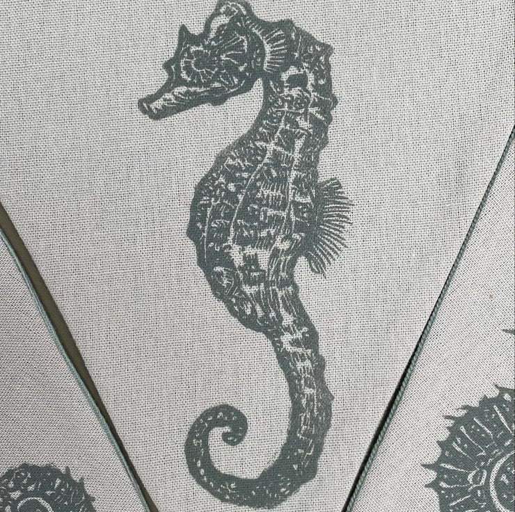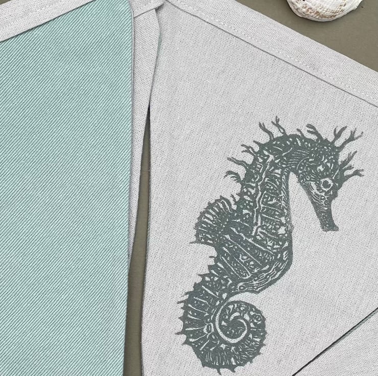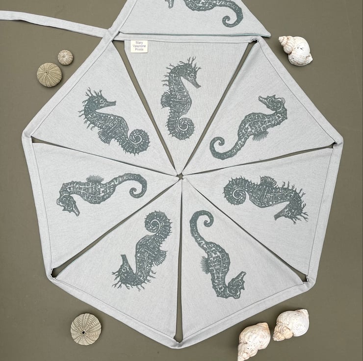 I have made this handprinted and crafted bunting using my original seahorse designs. They are long-shouted and short-shouted seahorses, which are both native to the uk.