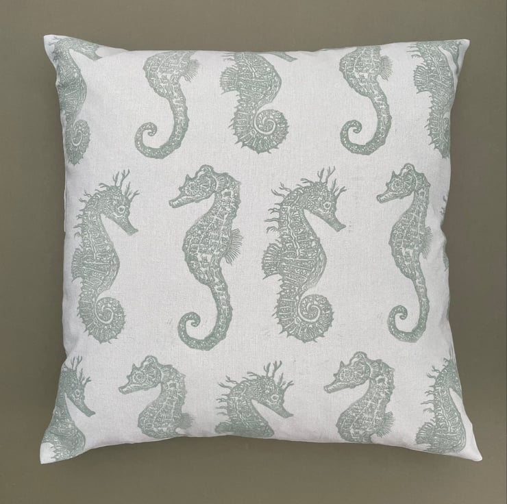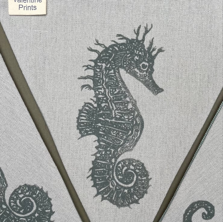 The seahorses are printed in green onto green/grey cotton/linen mix fabric, using Cranfield Safewash Ink.