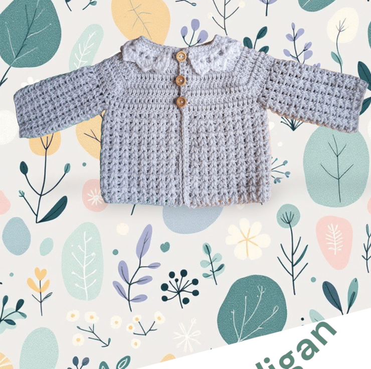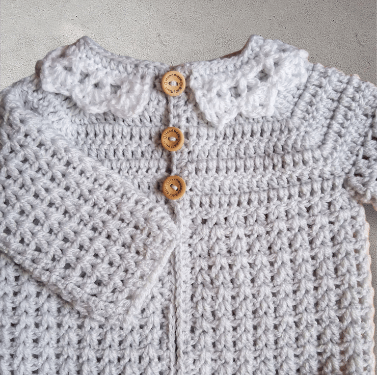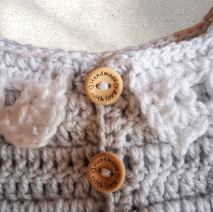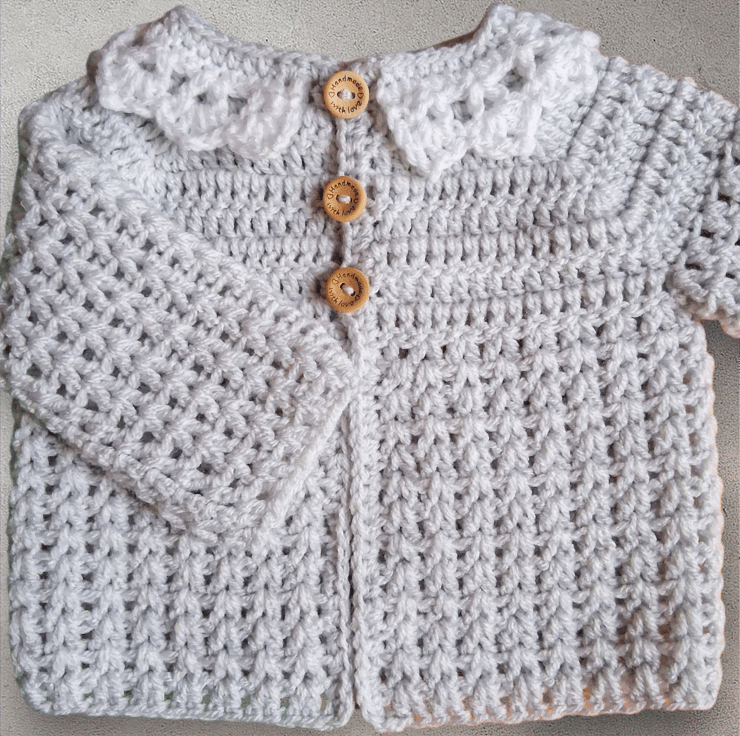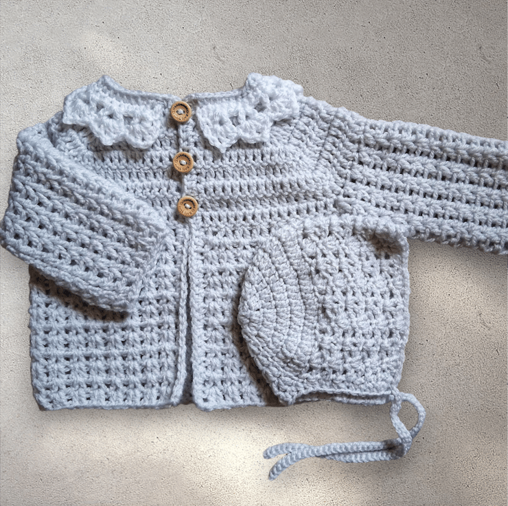 Lovely pale grey/silver baby cardigan with white crochet collar, finished off with cute wooden buttons. Can be bought on its own or as part of a set with a sweet bonnet (extra £5). Bonnet can also be bought alone from a separate listing (£7).