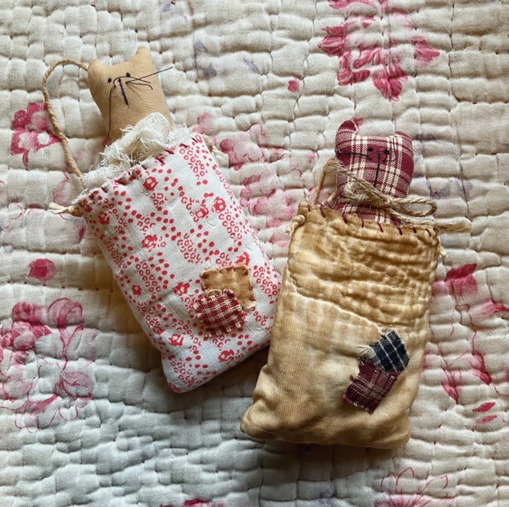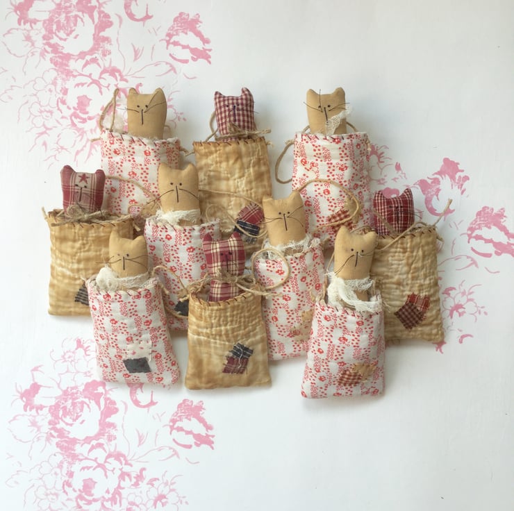 The kitten is made from tea stained cotton. The face and whiskers are hand stitched. Finished off with a scrim bow, tied around the neck.