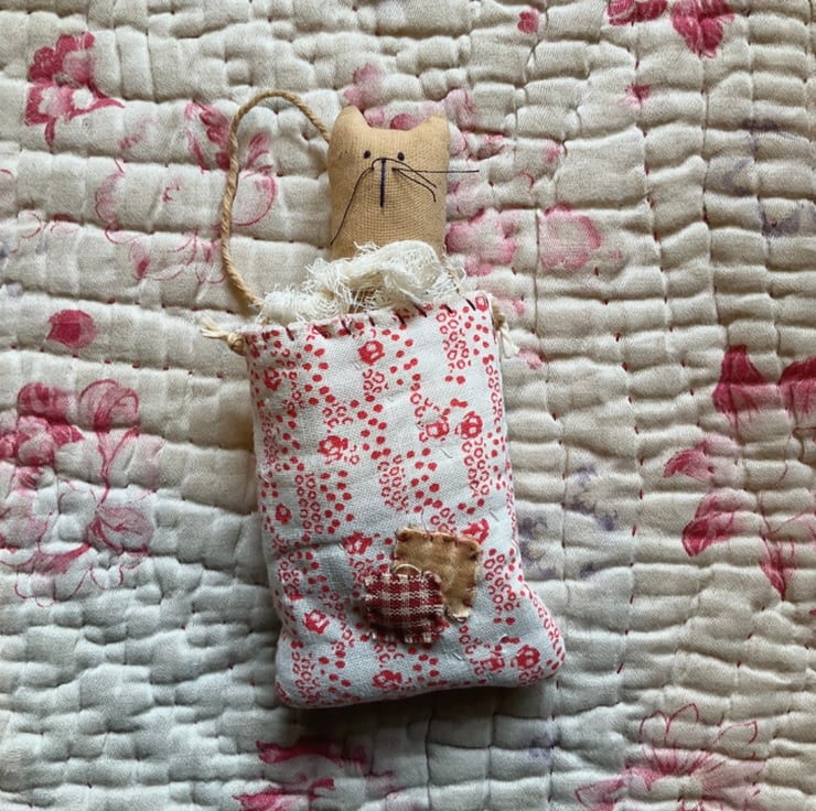 A kitten all tucked up cosy in a small hanging pocket, made from a piece of vintage quilt. The pocket front has two small hand sewn patches. the top of the pocket has been left with a raw edge which has been finished with an overcast stitch.