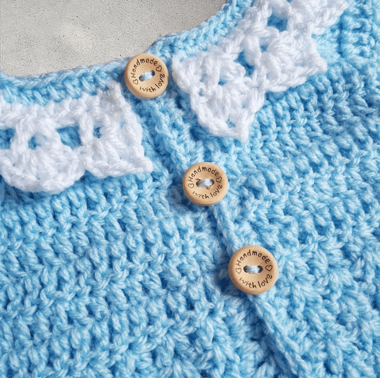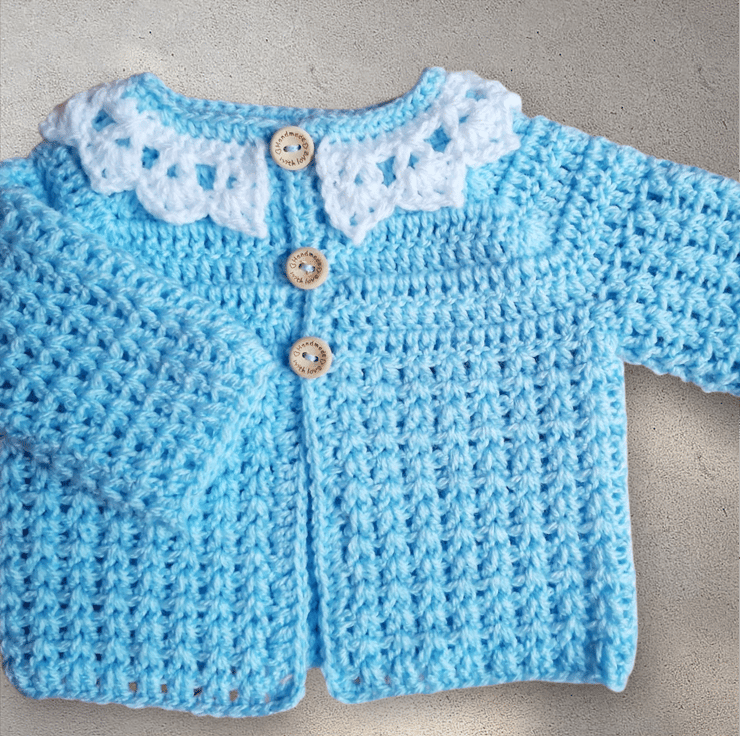 Lovely powder blue baby cardigan with white crochet collar, finished off with cute wooden buttons. Can be bought on its own or as part of a set with a sweet bonnet (extra £5). Bonnet can also be bought alone from a separate listing (£7).
