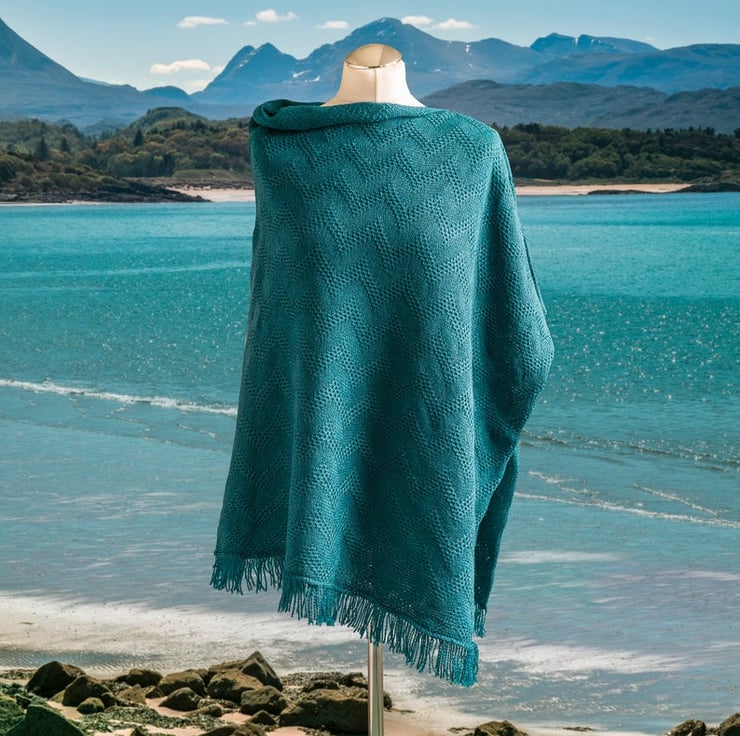 Seashore Textured Waves Asymmetric Poncho, crafted from luxuriously soft British spun Merino Wool and beautifully adorned with a fringe. This chic poncho provides exceptional comfort, making it ideal for casual looks with jeans and a t-shirt or for dressing up on special occasions. A genuinely versatile staple for your wardrobe, it enhances any ensemble with ease. Experience the perfect blend of style and comfort with this essential piece.