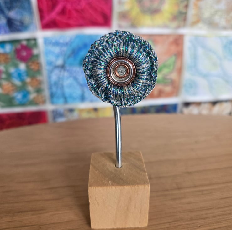 Metal, wire, flower photo holder for those special photos you love to see all the time. It holds one photo. It is 12cm in height and the flower is 3 cms in diameter. It is stood on a square piece of wood.