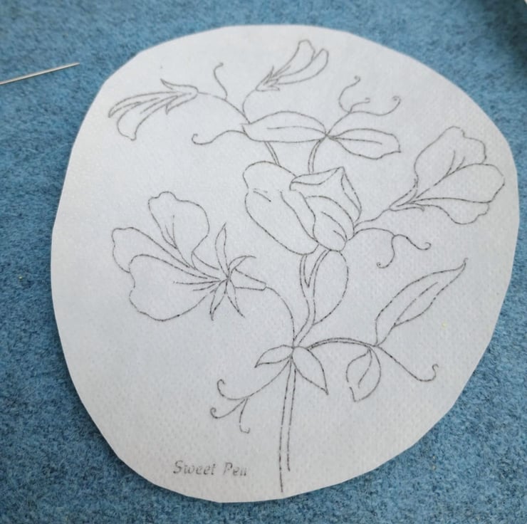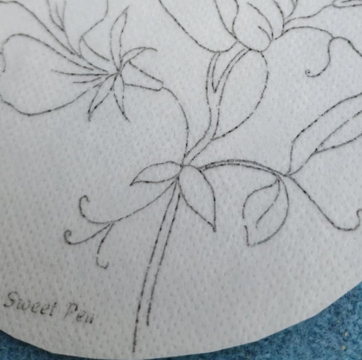 Sweet Pea - this lovely embroidery motif is based on a vintage motif transfer from the early 1900's. Available in a choice of stitch and sew adhesive material or non-stick stabiliser paper, both are easily dissolved with warm water, so you can start sewing without needing to transfer the image.