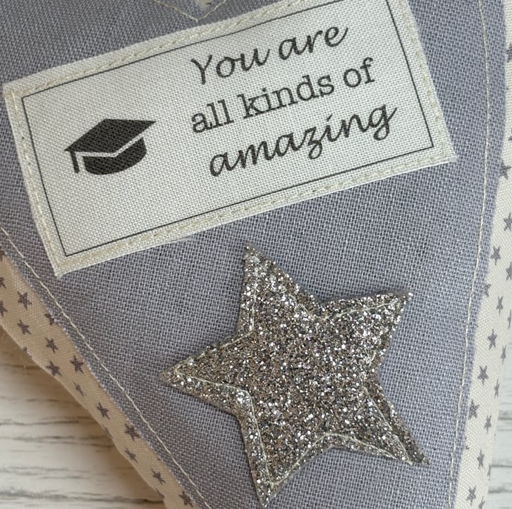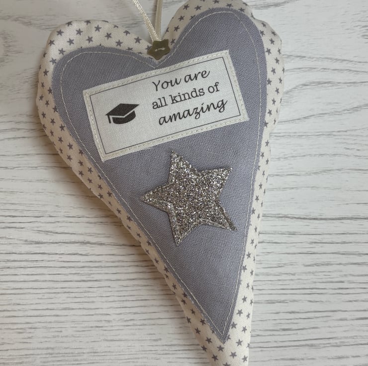 This pretty padded heart is made from a mini grey star fabric. It has a grey linen centre which has a label with a printed mortar board and the words ‘You are all kinds of amazing’ plus a silver glittery star.