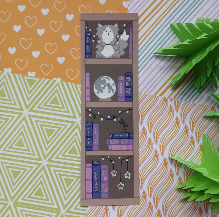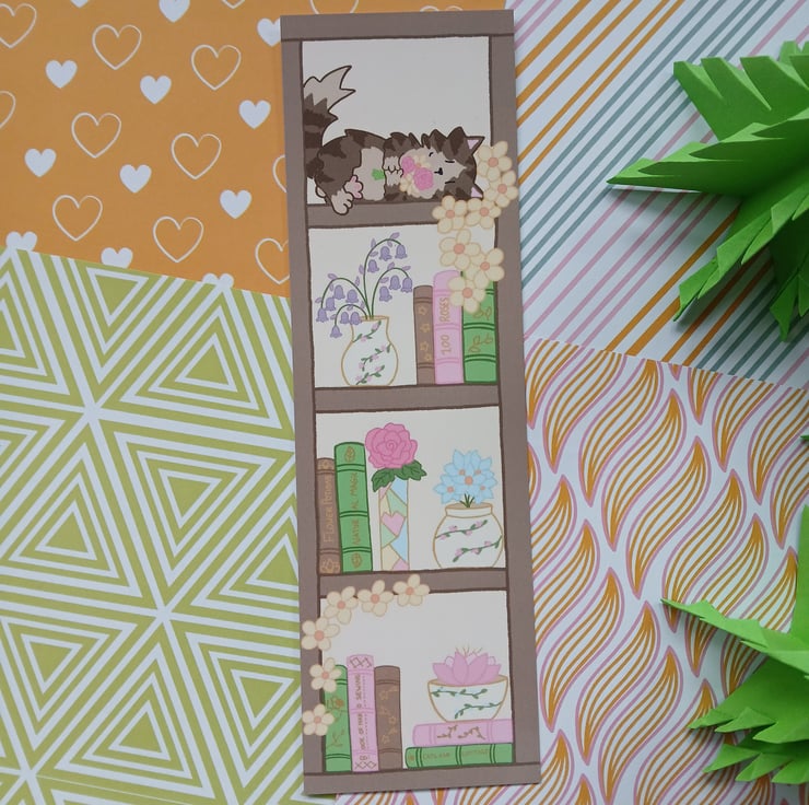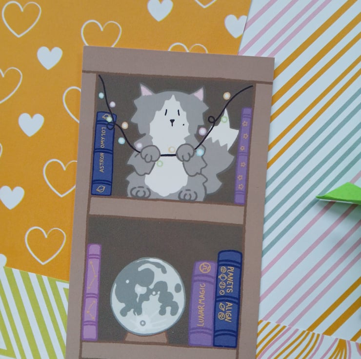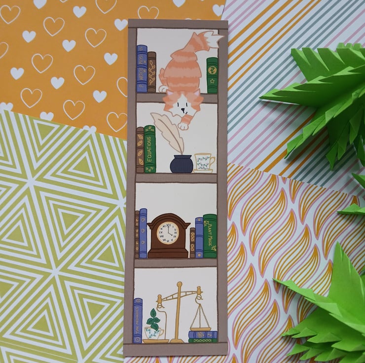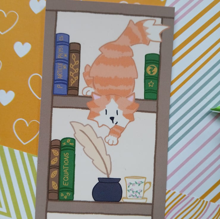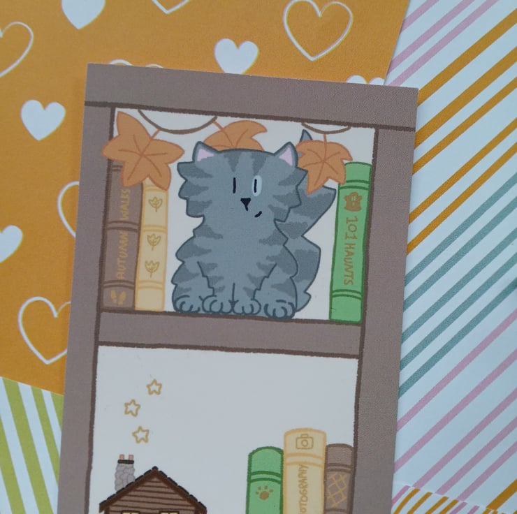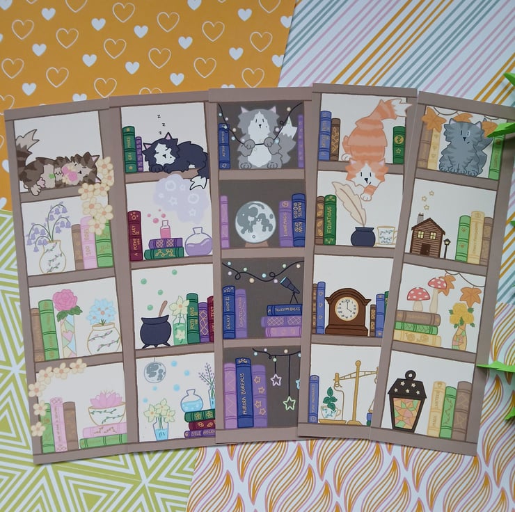 In a quiet corner of the library, five cute cats check out the books! These bookmarks are printed at 18cm tall, so they won't get too easily lost in your book, and for readers on the go, the heavier cardstock makes these bookmarks a little more sturdy. Each design has been hand drawn by me, and features a different theme.
