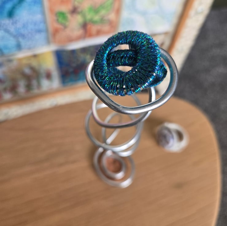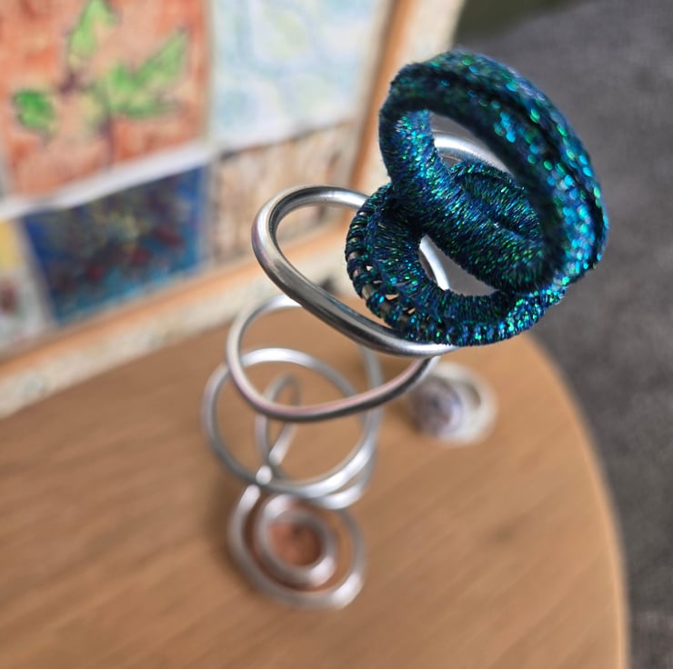 This is a beautiful addition to any jewellery collection. It has been made by covering metal rings in blue and green sparkling metallic thread. It is very lightweight to wear. It is approx size Q (57mm). The top circle is 2.5cm in diameter.