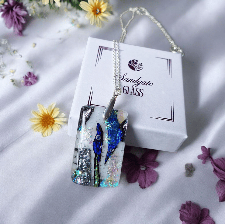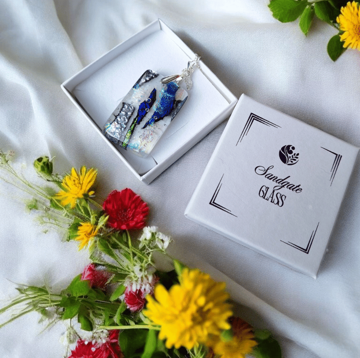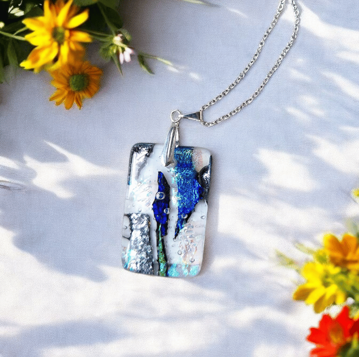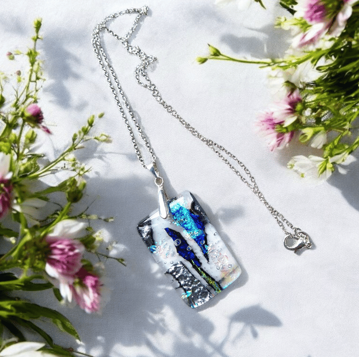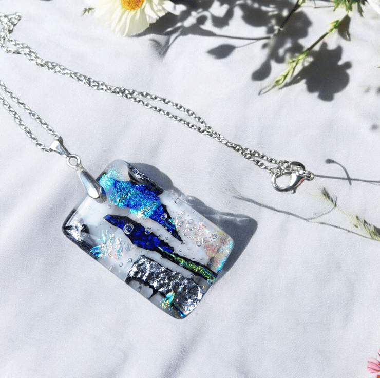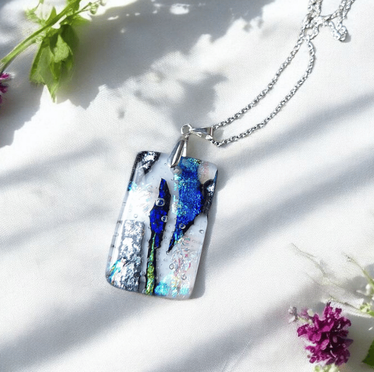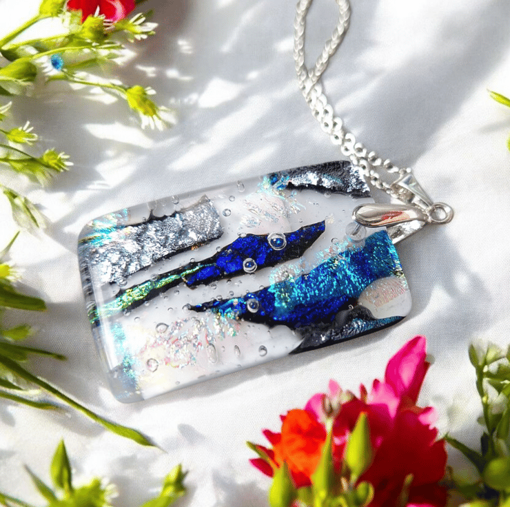 The pendant measures approximately 4 cm long by 2.5 cm wide and features flashes of blue, silver, and iridescent colours that sparkle from every angle. Every pendant is completely unique — a wearable piece of art that’s both eye-catching and meaningful.