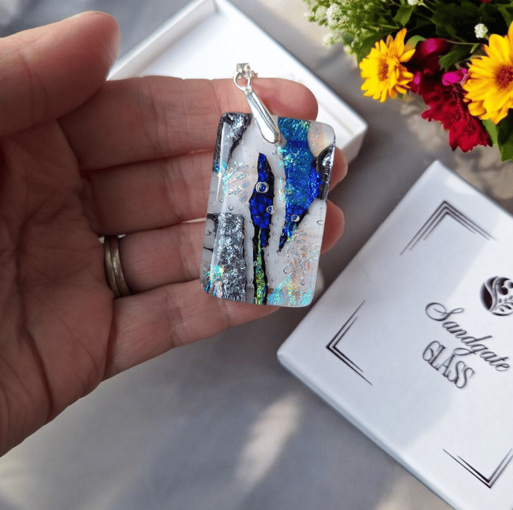This one-of-a-kind fused glass pendant has been handmade with care in my home studio in Blackpool, UK. I’ve layered shimmering pieces of dichroic and transparent glass to create a striking colour-shift effect that changes with the light.