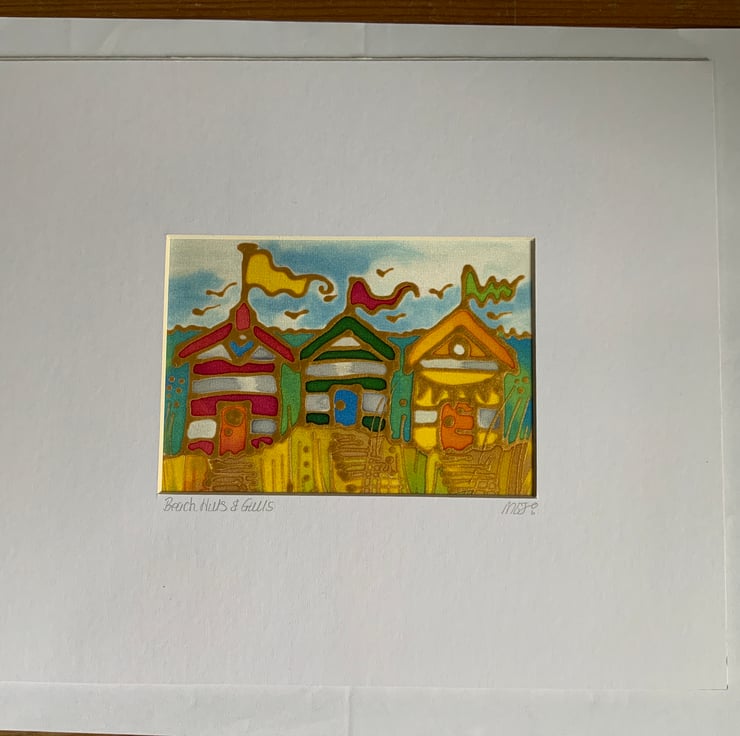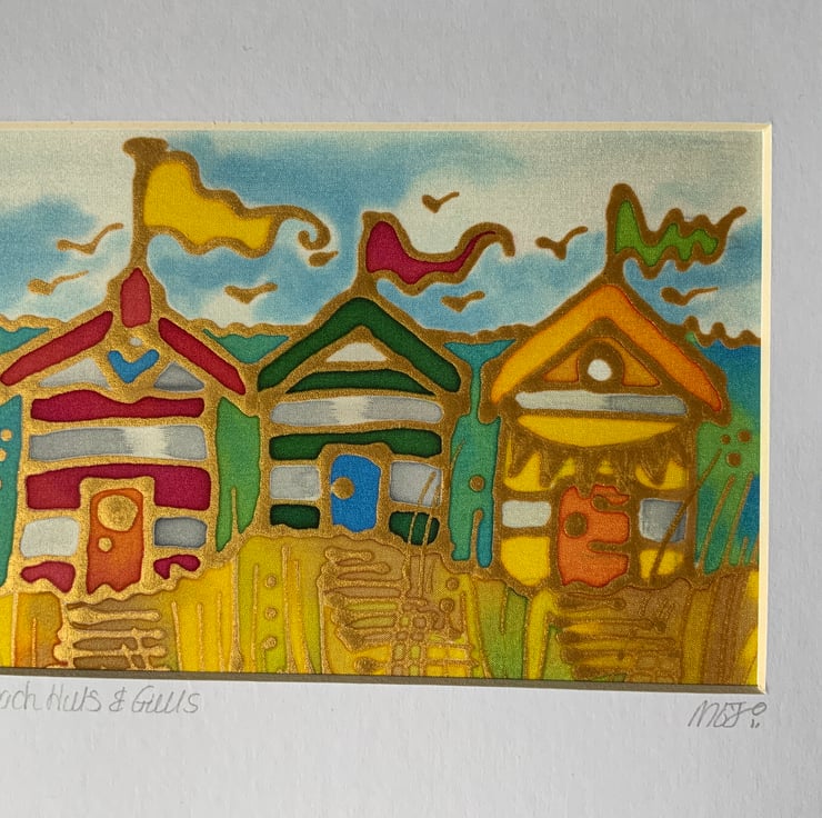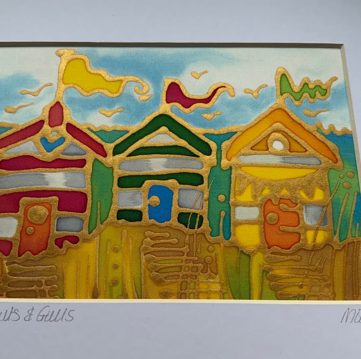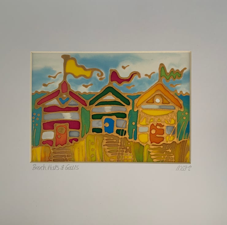 Beach Huts and Gulls is hand painted on silk and measures approx 6” x 4”. Finished mounted size 10” x 12”. It is outlined in metallic gutta on heavyweight silk. The silk is then mounted onto acid free self adhesive board or sheets for rigidity.
