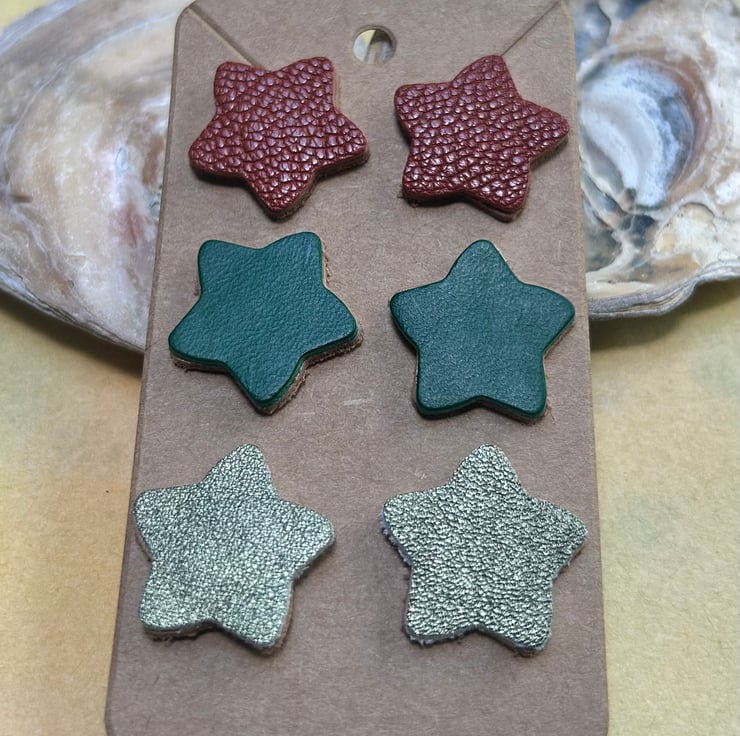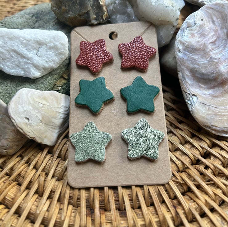 Three pairs of leather star earrings. Made with quality vegetable tanned leathers and backed with a quality natural veg tanned leather to give strength.