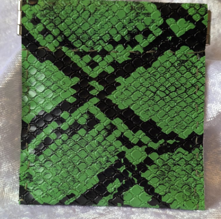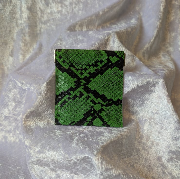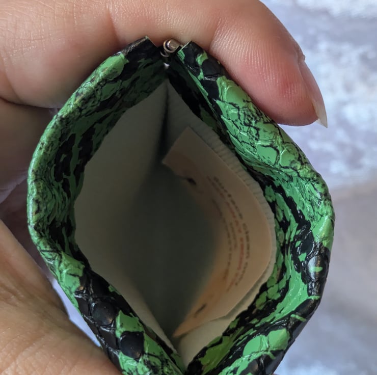 A vibrant green faux leather, snake skin effect, coin purse. Perfect size for a pocket or in your bag.This purse has a spring clip closure, you put pressure on the sides of the clip and press hard to open it. This purse measures 7.5 cm x 8 cm.