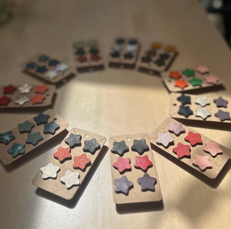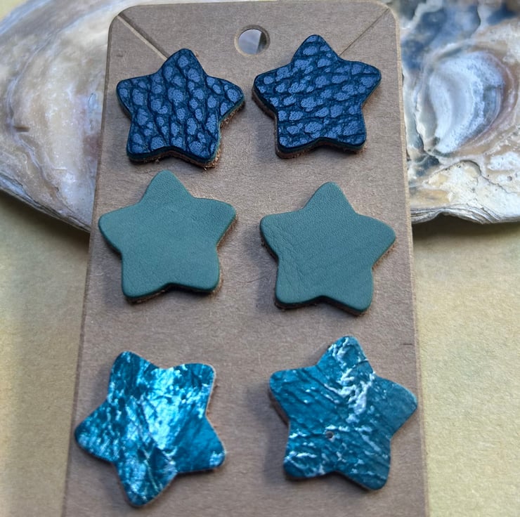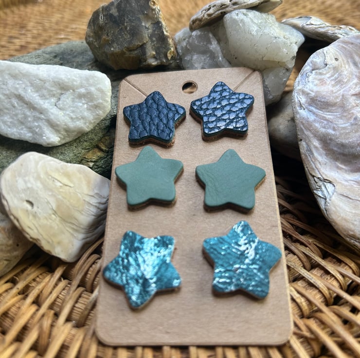 Here’s a trio of leather star earrings in blues and greens. Made with quality vegetable tanned leathers and backed with an undyed leather to give strength.