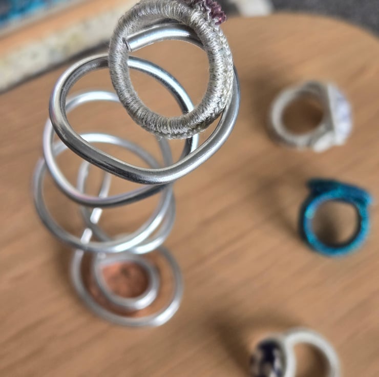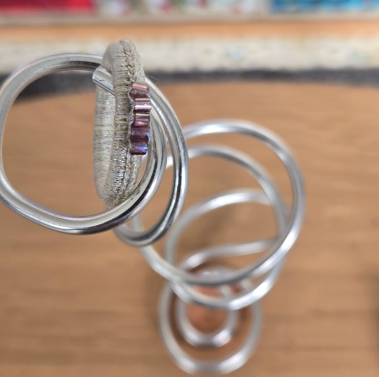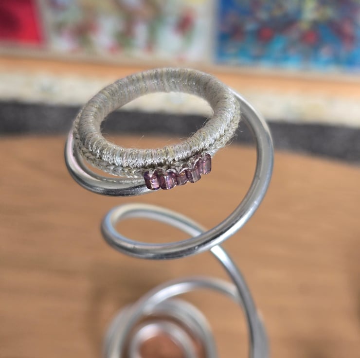 This is a beautiful addition to any jewellery collection. It has been created using metallic thread over a metal ring. It is very lightweight to wear. It is approx size S (59mm). The pinkish seed beads glisten in the light.