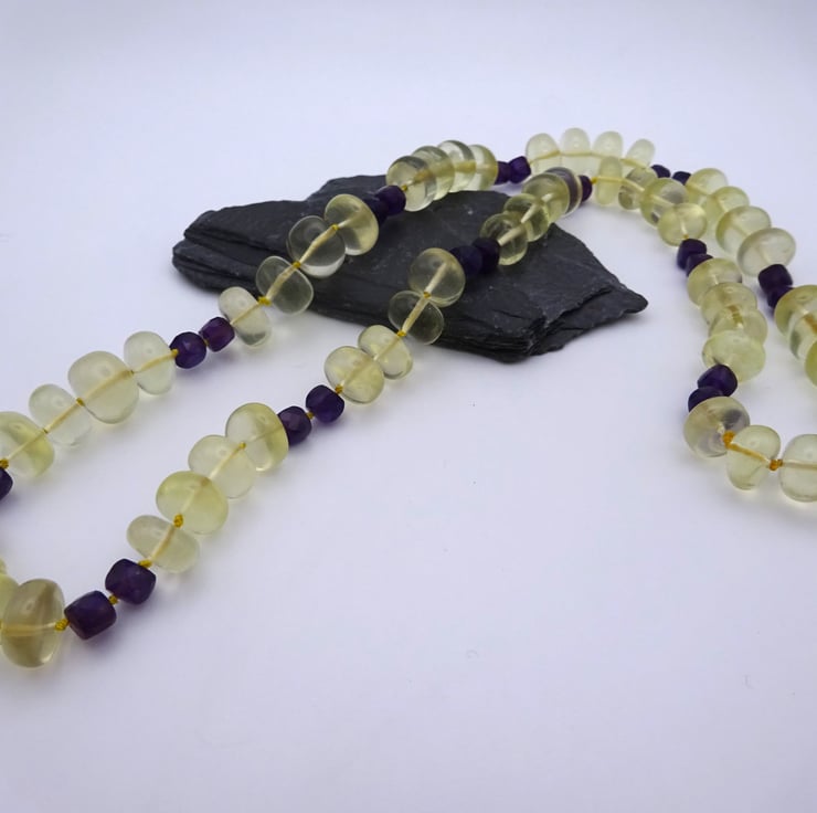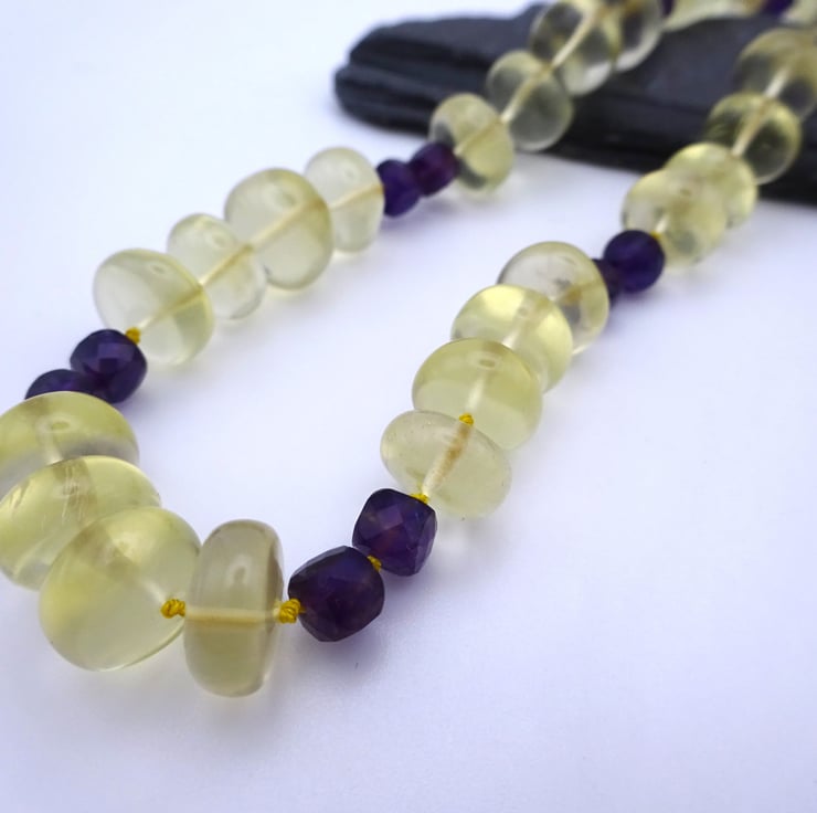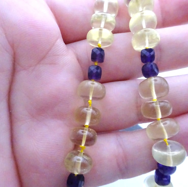 A necklace made with knotted yellow silk thread and features Lemon Quartz and Amethyst gemstone beads.