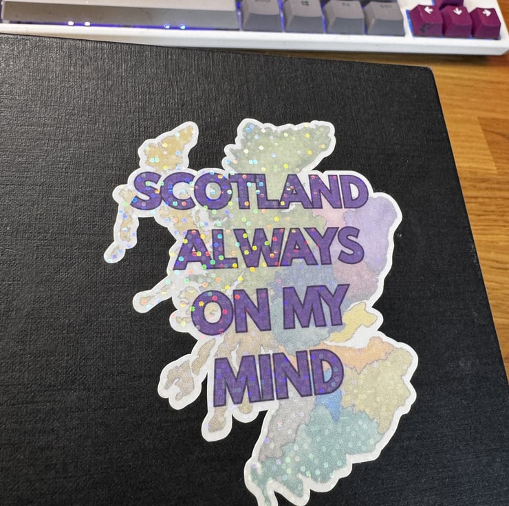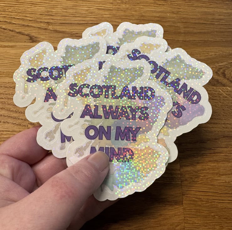 Show your love for Scotland with this holographic sticker - I have used my illustration of the Scottish map and added the slogan "Scotland Always On My Mind" in purple lettering.