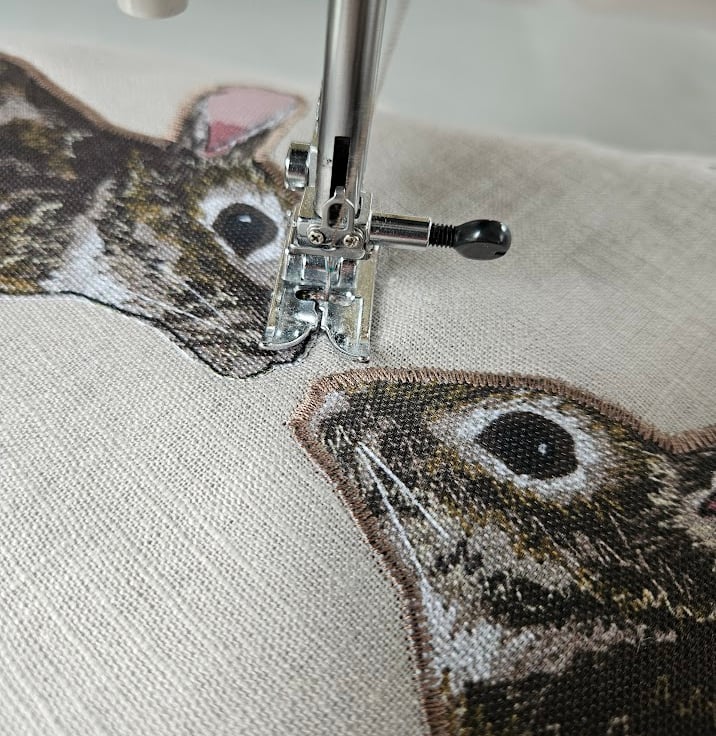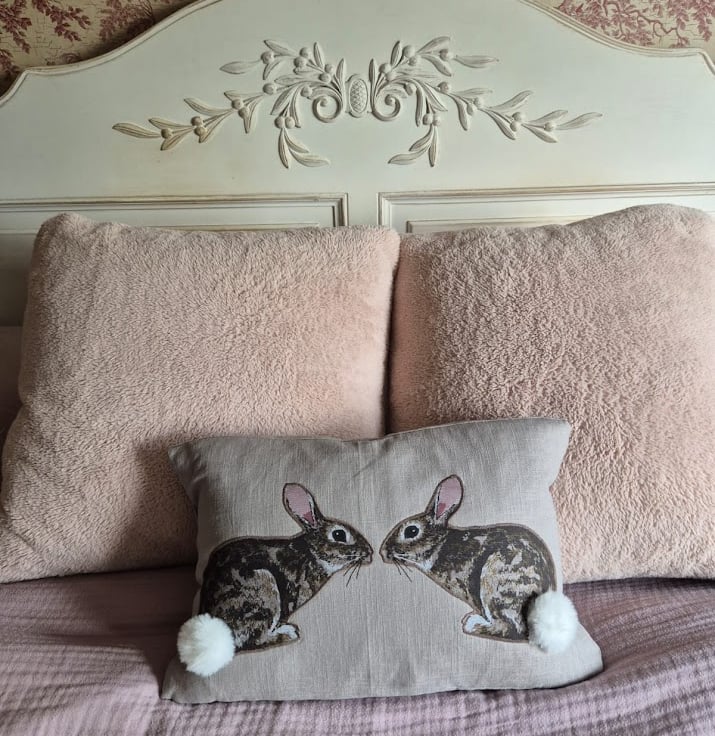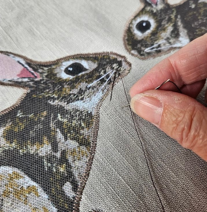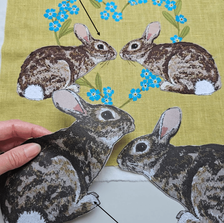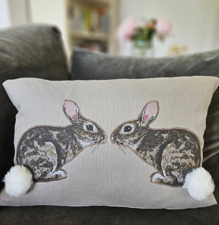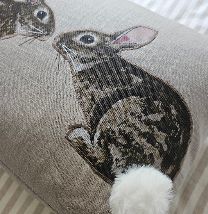 The rabbits are digital fabric prints of an original fabric applique and freehand machine embroidered design (see third photo). They have been machine stitched down onto the front of the cushion.