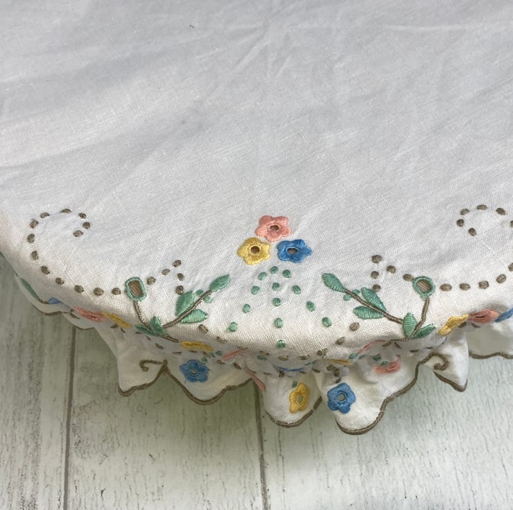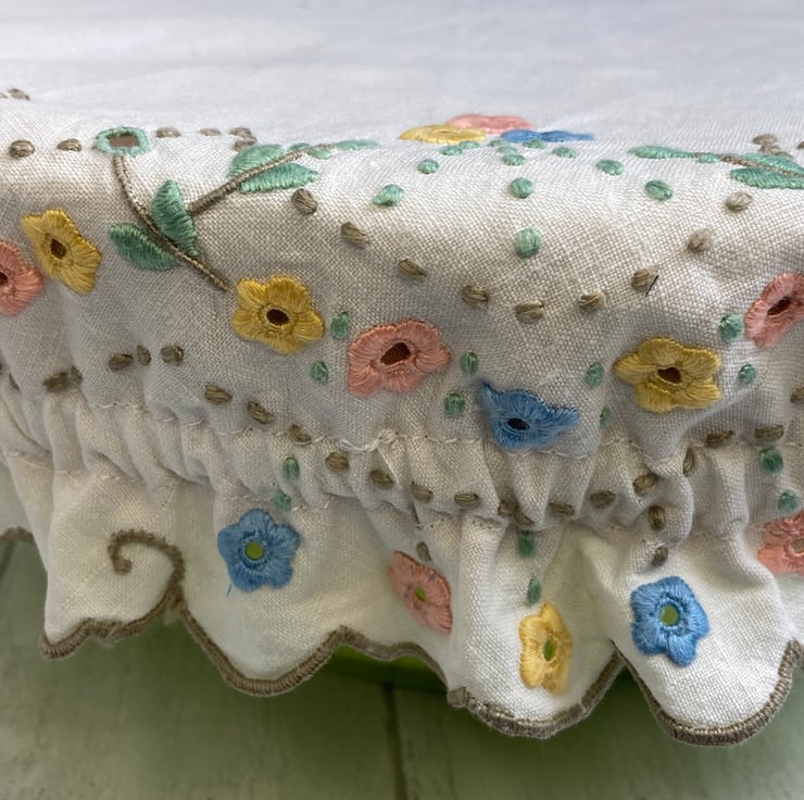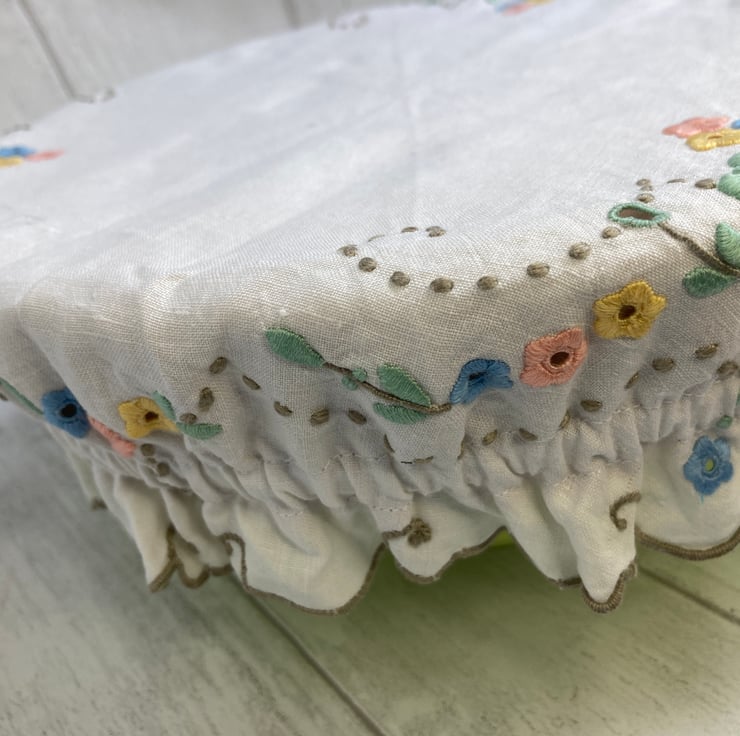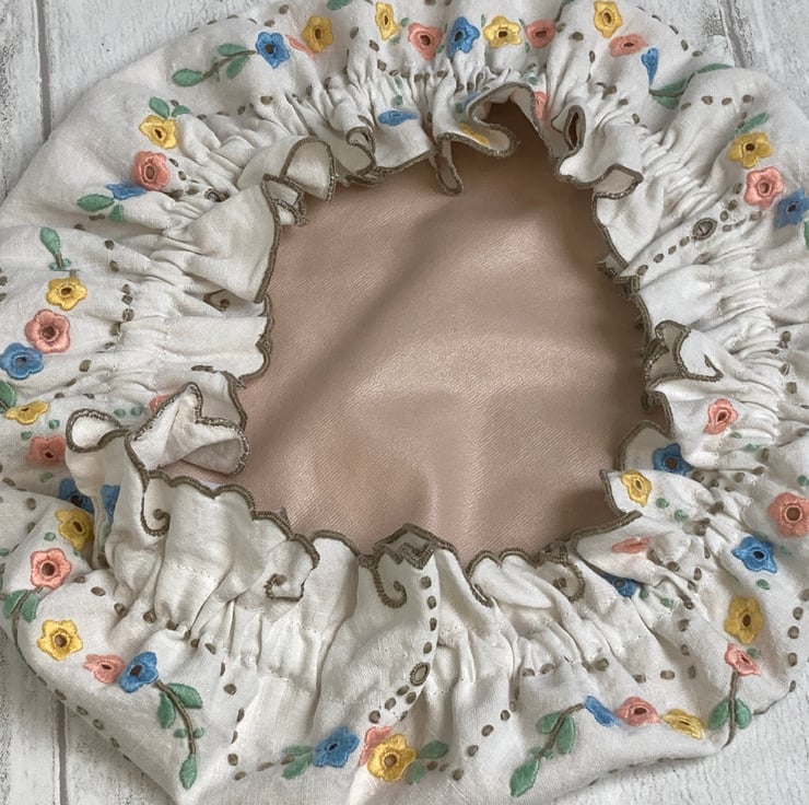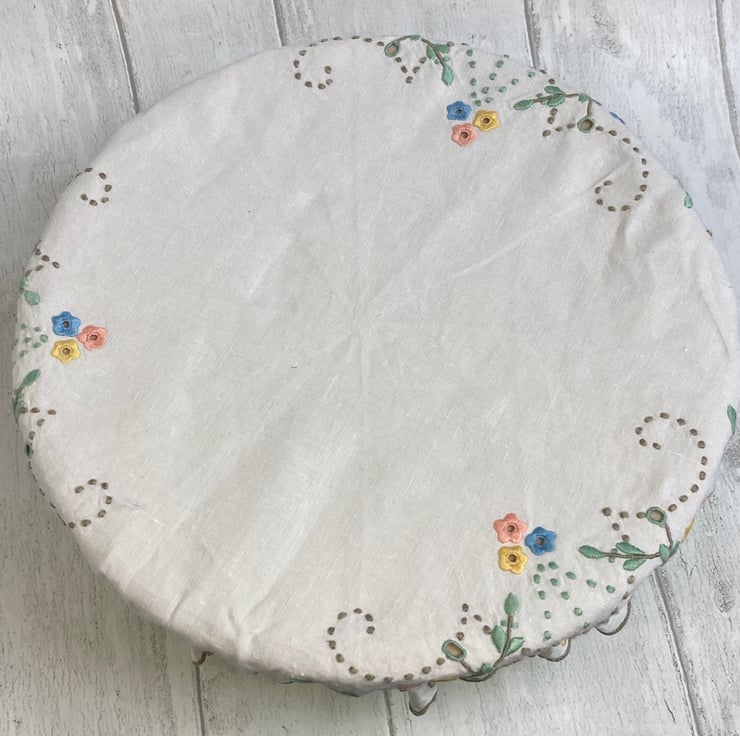 This gorgeous vintage tray cloth needed a new life and being turned into a bowl cover seemed the best way to keep all of the lovely features. It has simply been given a PUL lining (more about that below) and an elasticated rim, meaning that the lovely embroidery and scalloped edge are kept intact. It is an extra large size to fit over a mixing bowl (approx. 30cm diameter) or dinner plate. It is ideal for covering proving dough, fruit soaking for the Christmas cake or a bowl of salad waiting for guests. The outer fabric is cream linen embroidered with a pastel floral design. The lining is beige PUL - a soft, waterproof and breathable fabric that has been manufactured in an environmentally friendly way. It is safe for food use as it does not give off any toxic chemicals. The waterproofing comes from a thin layer of plastic which has been bonded to polyester fabric. It has been tested for at least 300 washes. Whilst not totally plastic-free, using our bowl covers may reduce your need for foil or cling film.