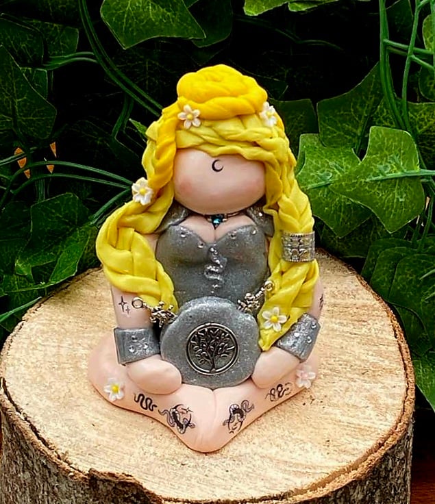 This beautiful handmade clay shieldmaiden is dressed in armour with shield and metal swords, she has plaits and a dread ring decorated with resin extras and tatoos .She stand 4 inches tall the perfect gift for your fierce powerful maiden. Comes gift wrapped.