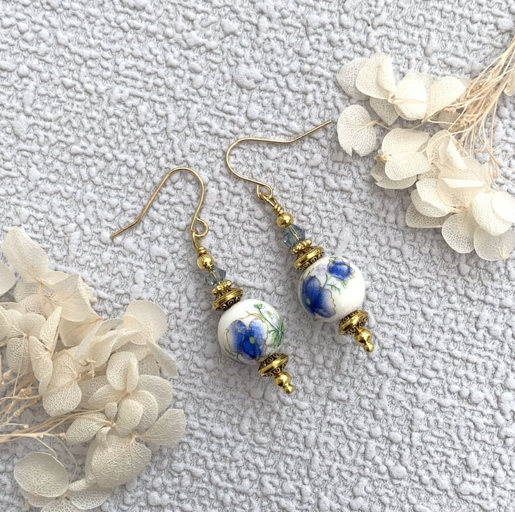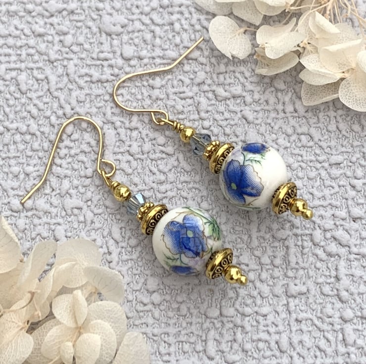These charming earrings are made with painted porcelain beads in a classic floral Chinese style. The earrings also include antique gold bead caps and tiny glass crystal beads. The earrings are finished with gold-plated ear wires and they are 4.5cm in total length.