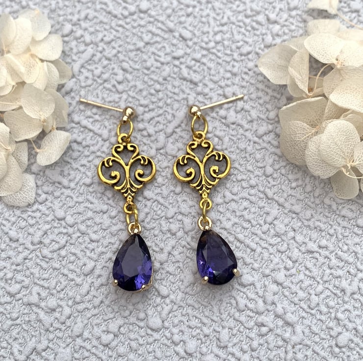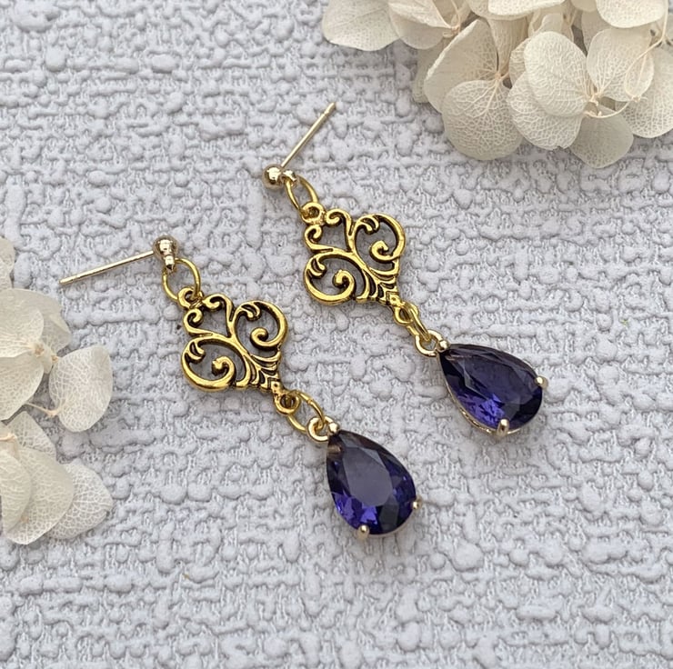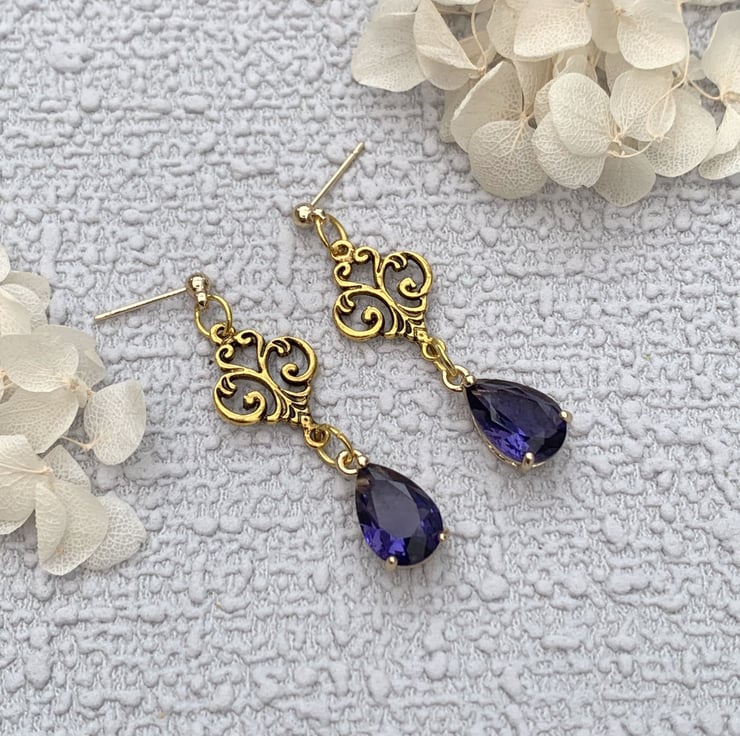 - Vintage Style Gold and Purple Glass Crystal Drop Earrings -