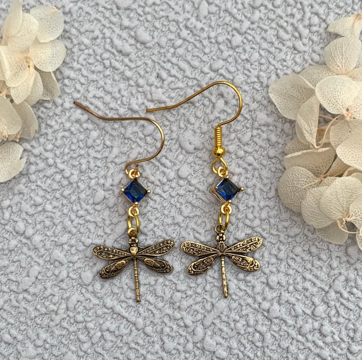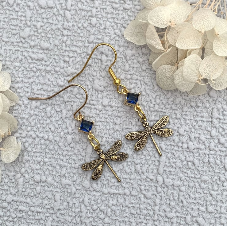 These charming earrings are made with tiny antique gold-plated dragonfly charms that are very detailed with patterns on the wings. They are connected to the earrings with blue glass crystal gold-plated square charms. The earrings are finished with gold-plated earring hooks and they are 4.5cm in total length.