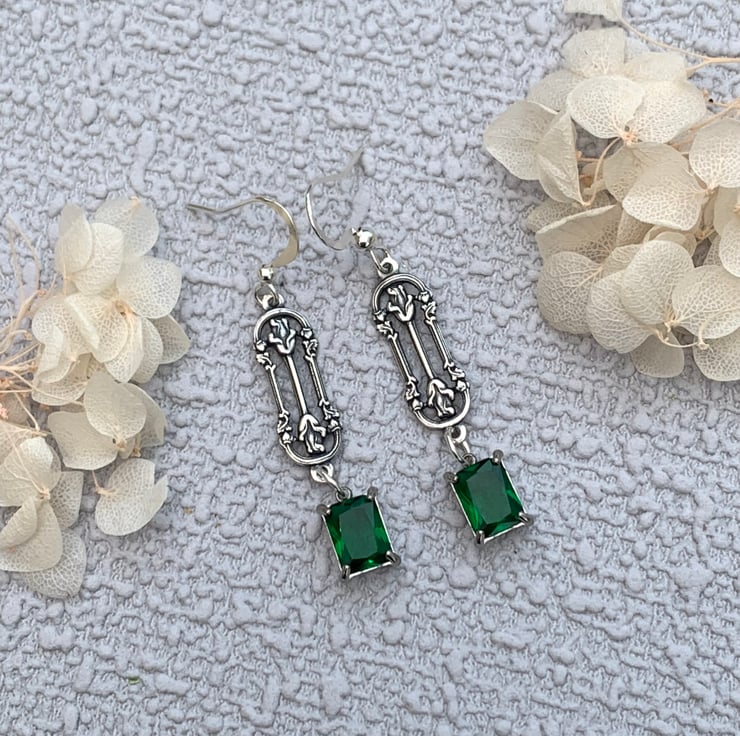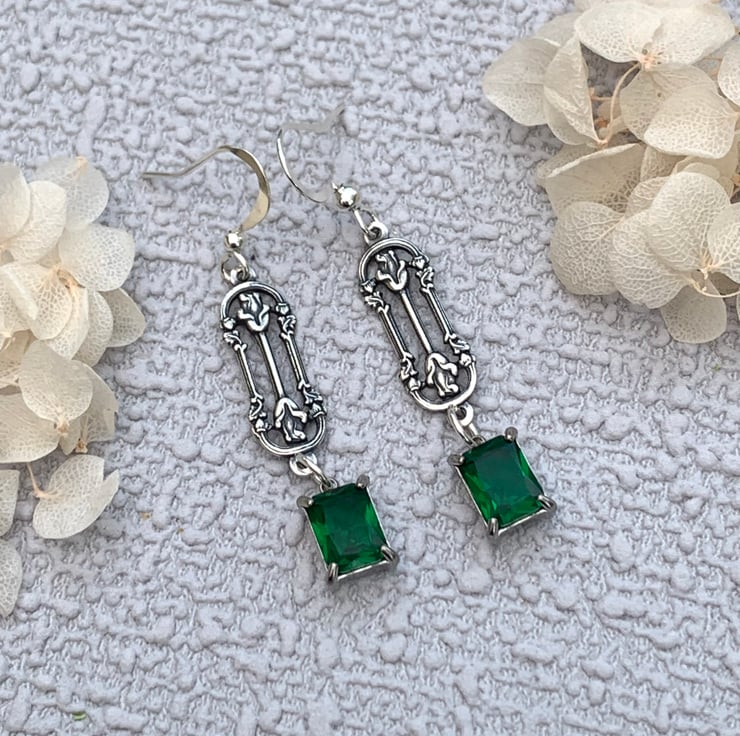 These pretty earrings are made in an Art Nouveau style with antique silver-plated floral design connectors which have green glass crystal drop charms suspended at the bottom. The earrings are finished with silver-plated earring hooks and they are 4.5cm in total length.