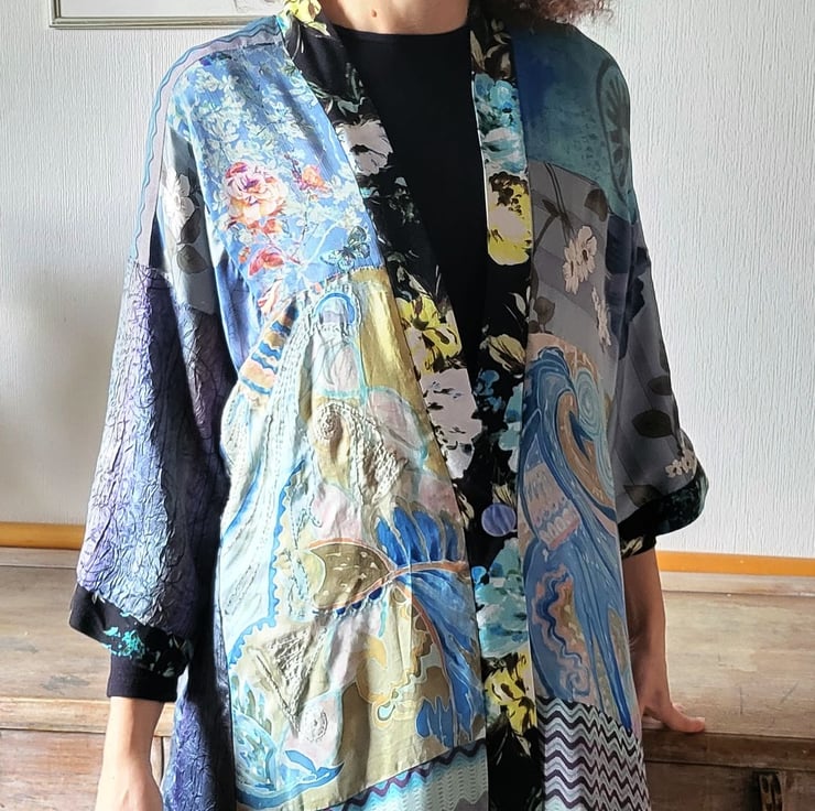 Kimono hangs very well due to soft flow of fabrics. Three quarter length sleeves. No pockets. One centre button. Fully lined in black/yellow/turquoise viscose shirt print, which appears as front welt and sleeve borders. Hem added to lining, around to upper, coordinating blue flowers on black.