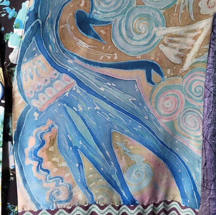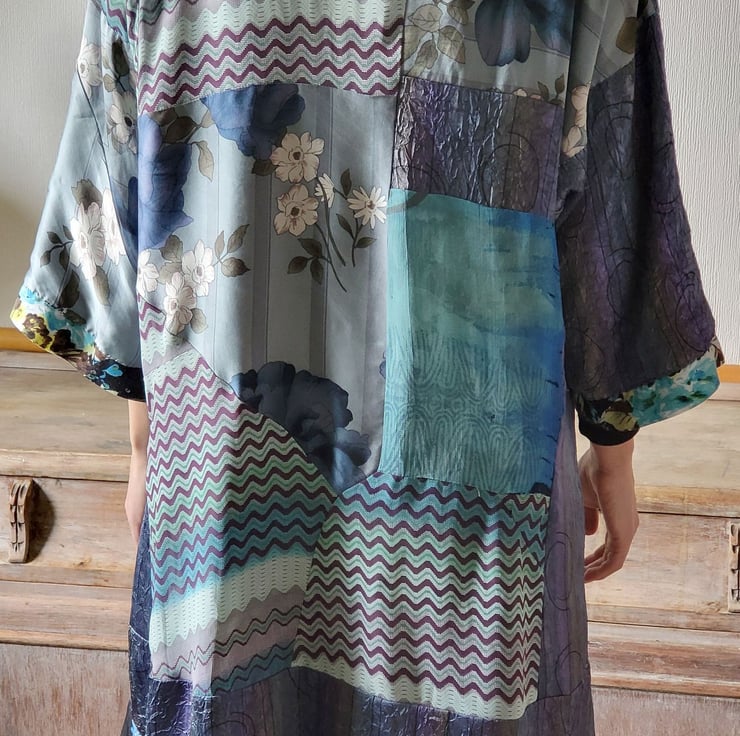 I had the silk painting already done, to use for either side of the kimono dress, then chose the flowing blues to coordinate.