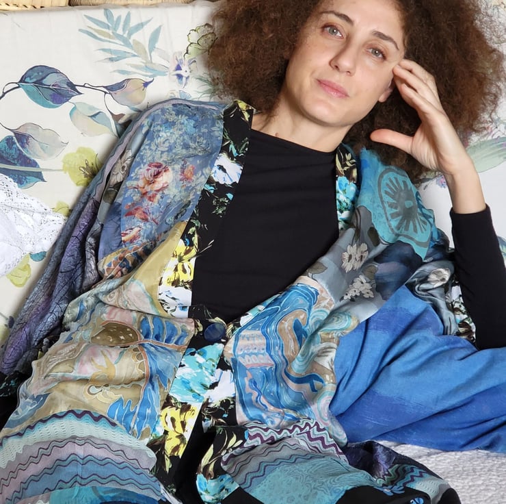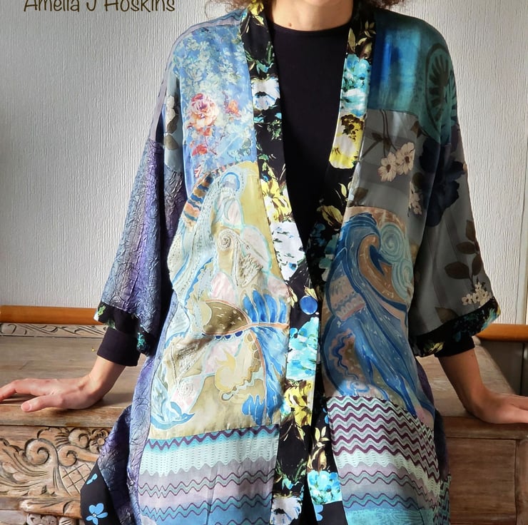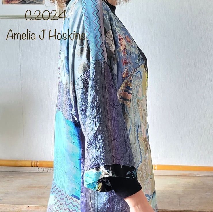 An arrangement of large patchworks in blues, ranging from ultramarine to light turquoise florals, stripes and abstract prints. Main focus is front sections. Both sides have my own original hand painted abstract silk designs, inspired by Hopi pottery designs.