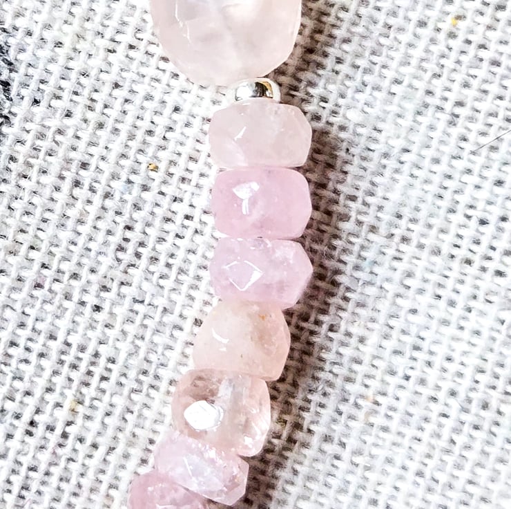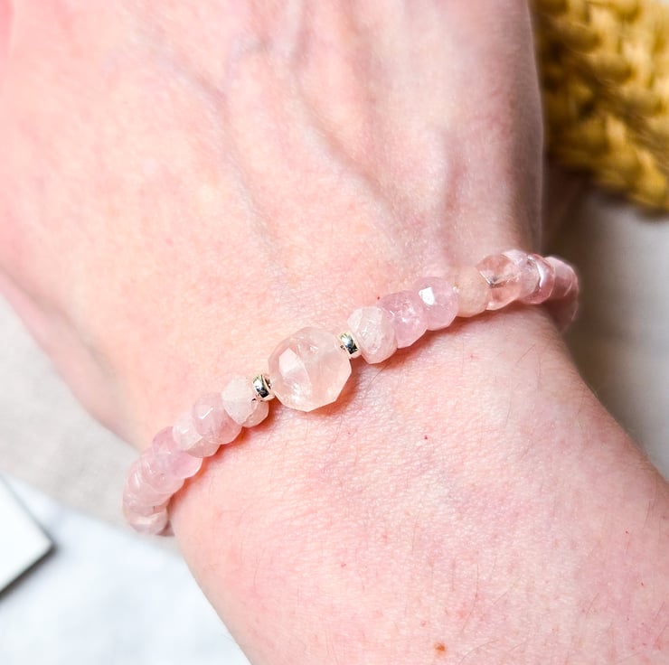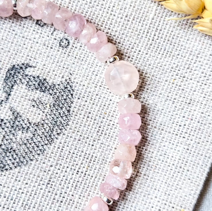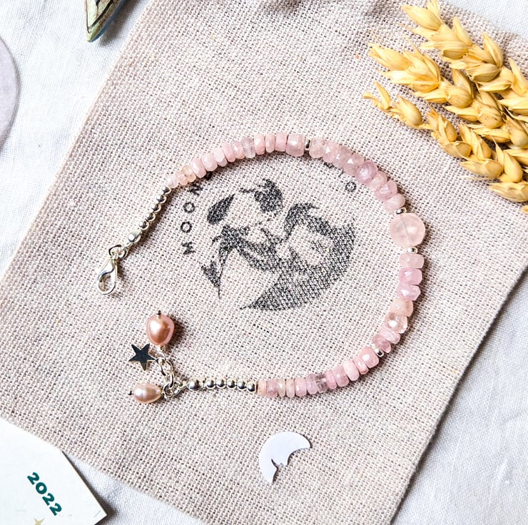 This unique, handmade bracelet is strung with dreamy, rare pink faceted Morganite gemstones, pink baroque freshwater pearls, and tiny sterling silver accents including a little star charm. The soft shimmer of the faceted Morganite catches the light beautifully, with a round faceted Rose Quartz bead at the centre.