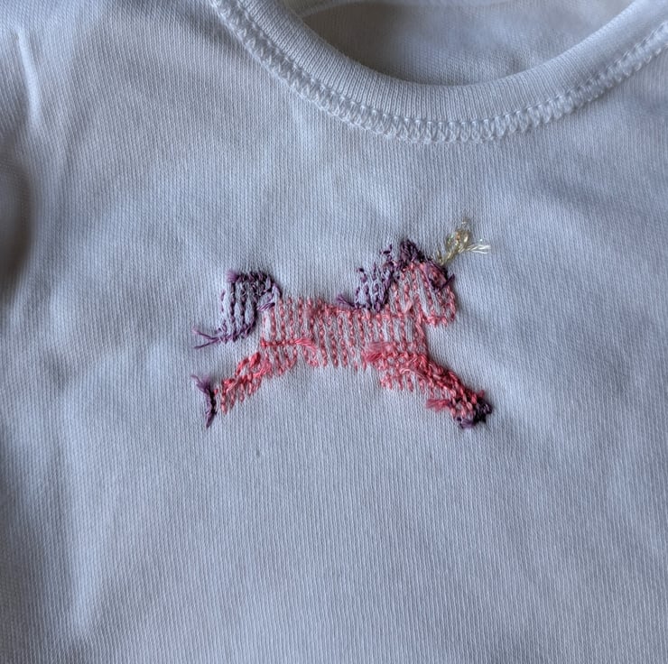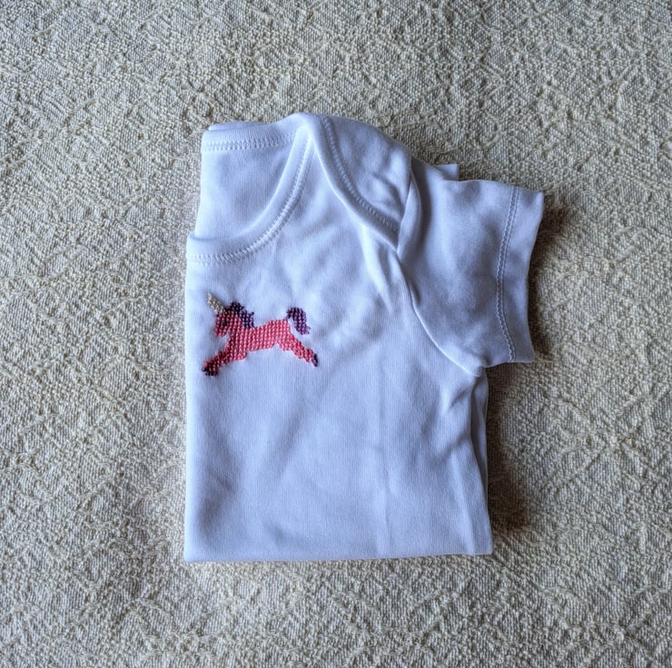 This is a very pretty white vest/onesie made extra special by the rose-pink unicorn I have hand-embroidered on the left front. It has a lilac mane, tail and hooves, and a sparkly ivory horn. As I never use a permanent backing material when hand embroidering kids' clothing, there is nothing inside the vest to irritate your child's skin. It has an envelope neck, short sleeves and three press studs between the leg openings. It is 100% soft cotton and can be machine washed.