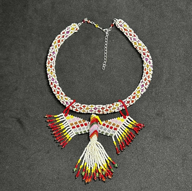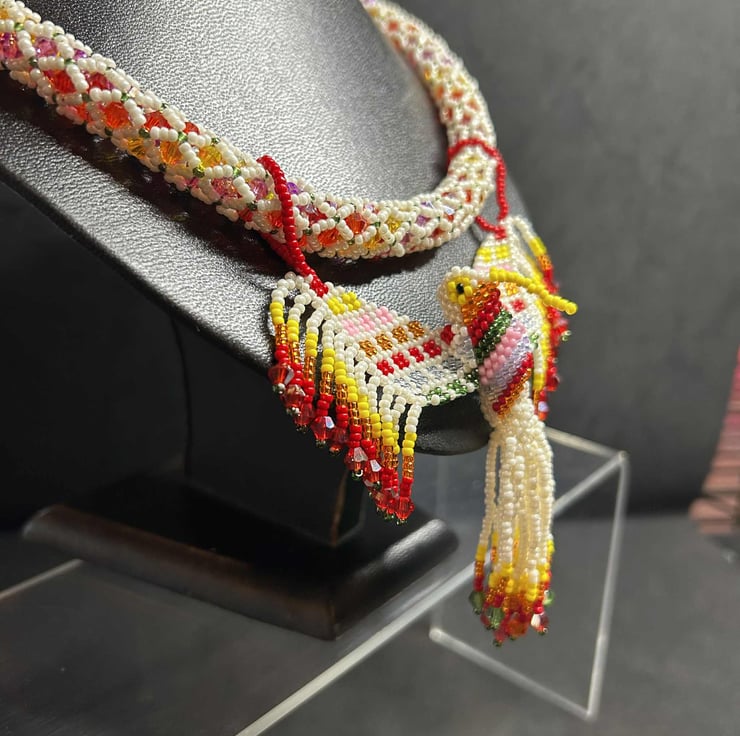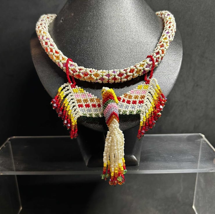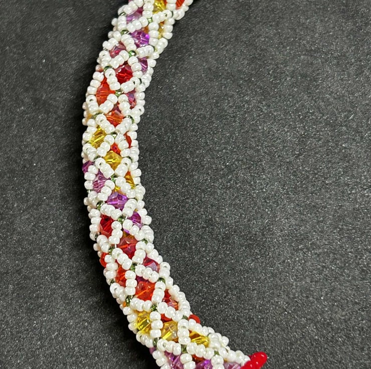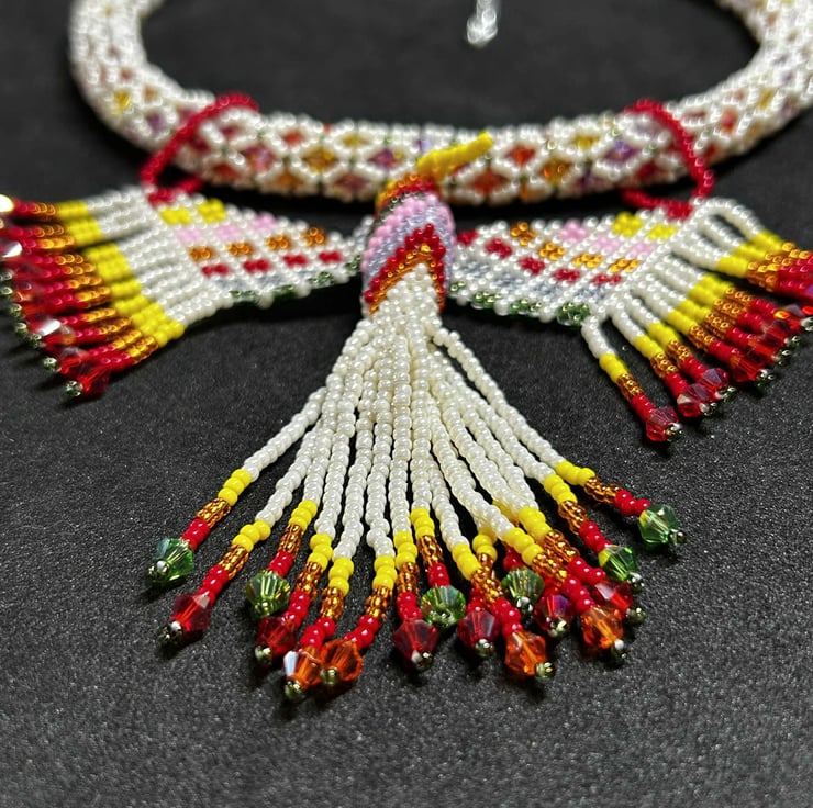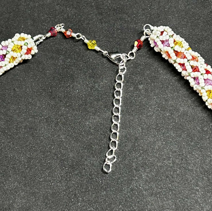 The neckline, suitable for 16 inches to 20 inches, is made from hundreds of crystals and a vast amount of Miyuki seed beads. The entire construction is glass, but it is lightweight and hangs around the neckline in a fabulous swath of impressive sparkle and colour.