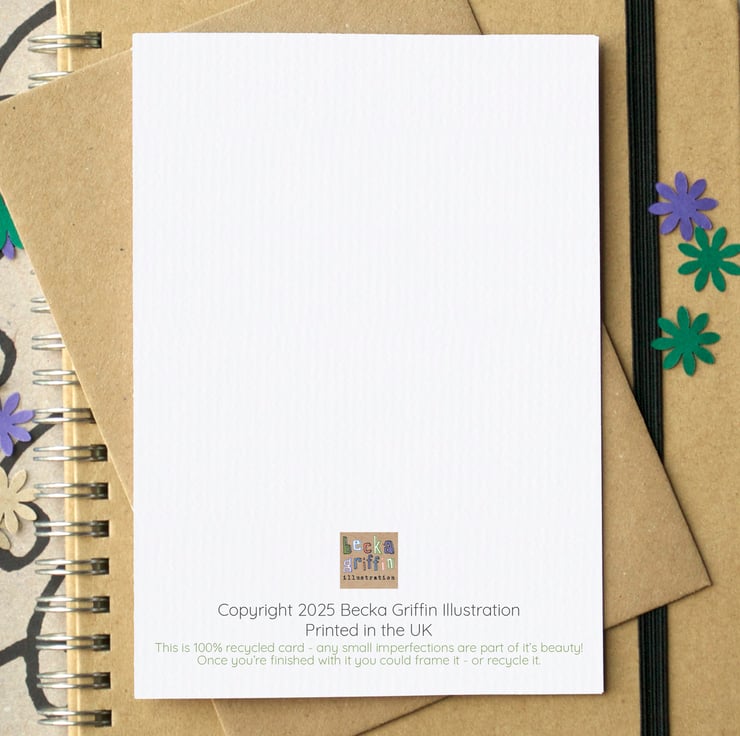 Printed onto smooth white recycled card, blank inside. Size approx 148mm x 105mm; brown envelope slightly larger.