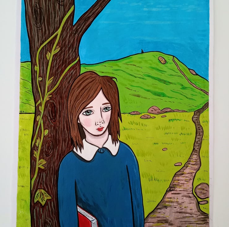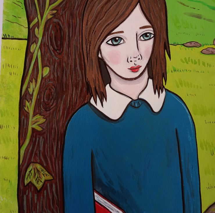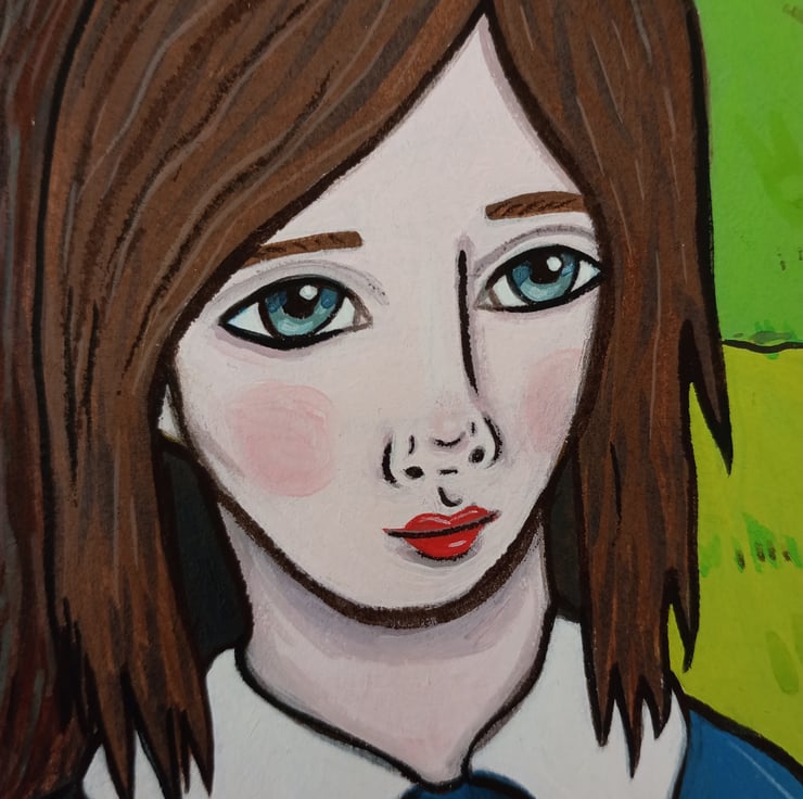 Original surreal, illustrative, acrylic portrait painting on paper.