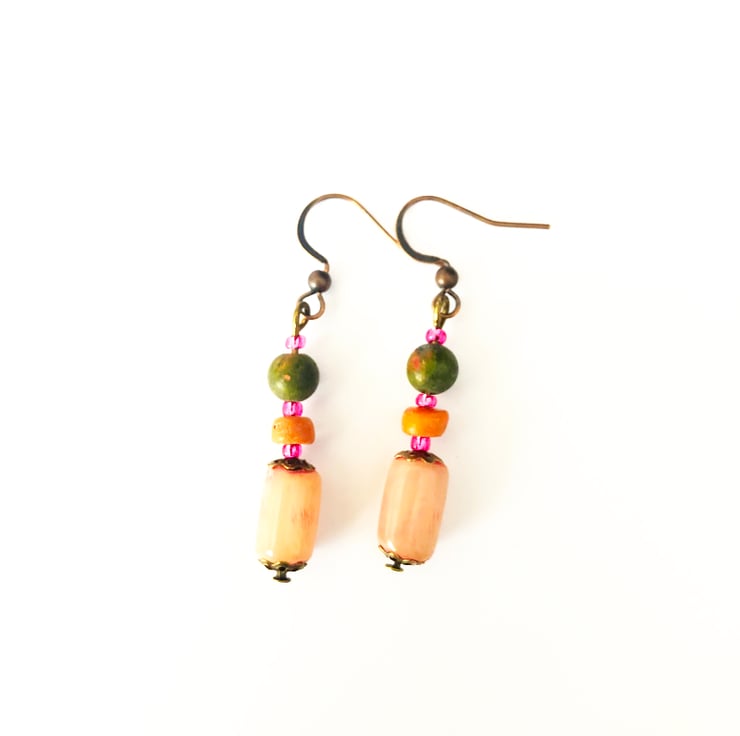 Light coral pink orange green pink seed bead earrings dangle drop earrings handmade by me using up-cycled and shop brought beads.