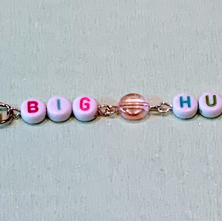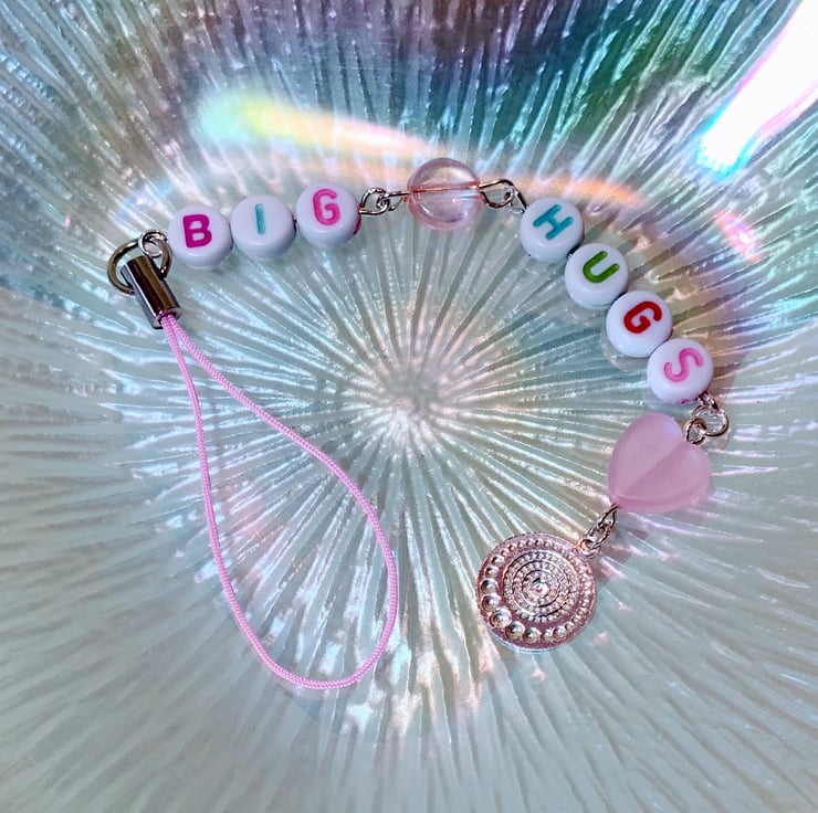 Featuring a lovely pale pink frosted heart and silver spiral with rainbow letter beads and a matching pale pink glass bead with matching pale pink cord.