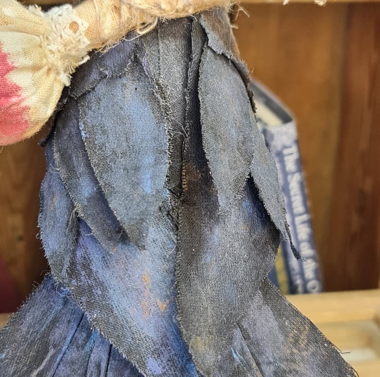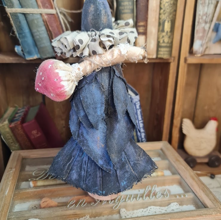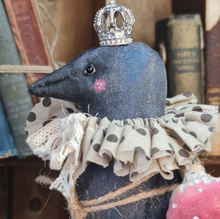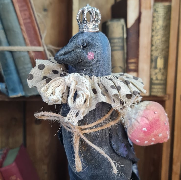 This wonderfully whimsicle piece is hand and machine stitched in unbleached cotton. Hand painted to give a shimmery primitive feel. Sitting on crows head is a wee metal crown ( another treasure found on Crows travels).Around her neck an E;izabethan style spotted ruffle. She has on her back a fly algaric toadstool tied with jute. She is mounted on a small circular wood plynth.