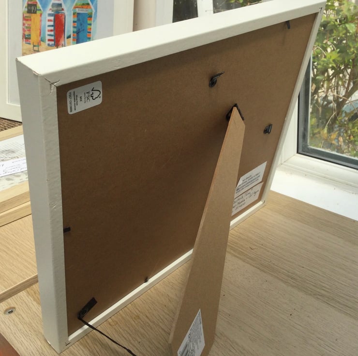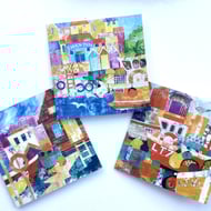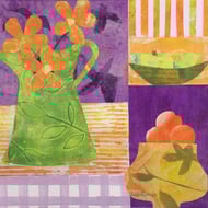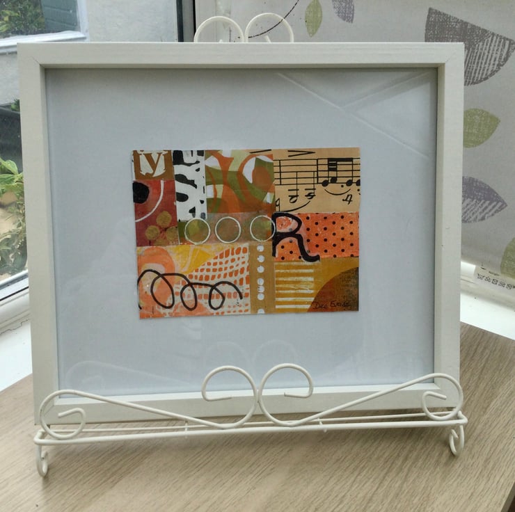 This colourful abstract art collage was created by my usual method of cutting and tearing scraps of my acrylic monoprints, left over from other compositions. The collage pieces were then assembled and fixed to mountboard in an abstract composition. The image measures 18cm x13cm and the frame measures 33cm x 27cm. The collage has a white border and a white self supporting frame.