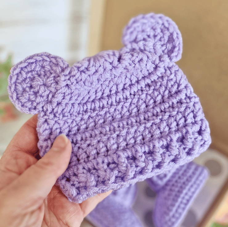 Welcome a little one with this adorable handmade baby set in soft wisteria purple. Featuring a sweet teddy bear beanie and matching booties, this newborn set makes a thoughtful baby shower gift, a beautiful coming-home outfit, or a keepsake for new parents.