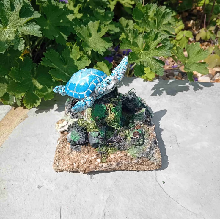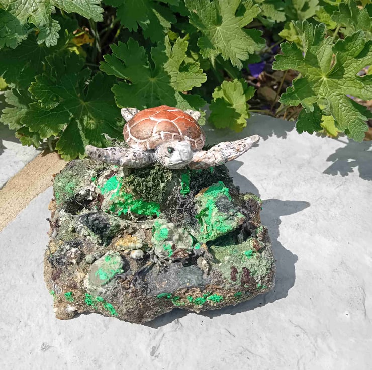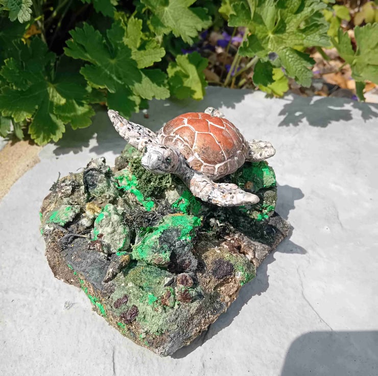 Two lovely Sea Turtles, swimming in suspended animation on a handcrafted diorama base. The base represents the sea bed with the addition of rocks and vegetation.